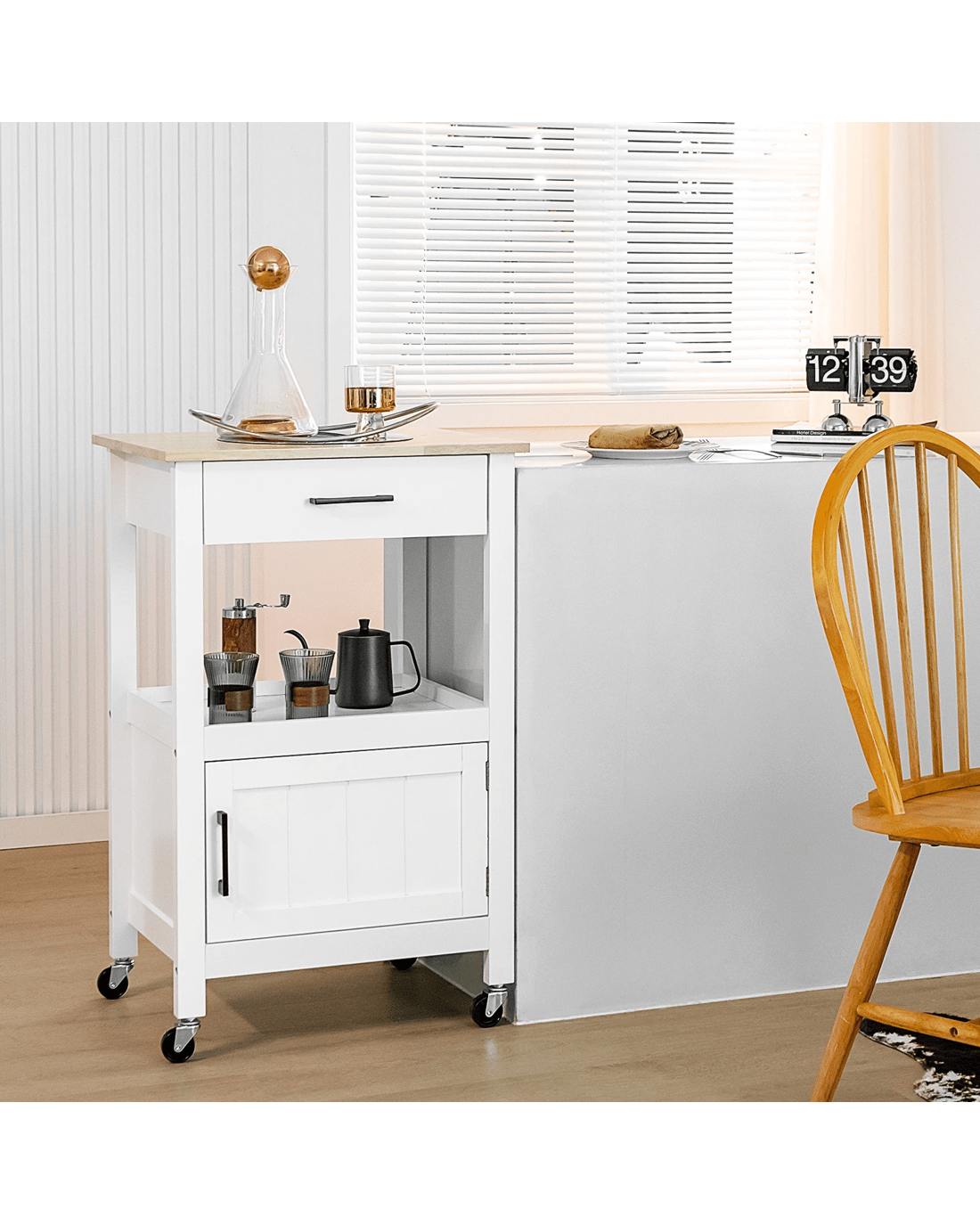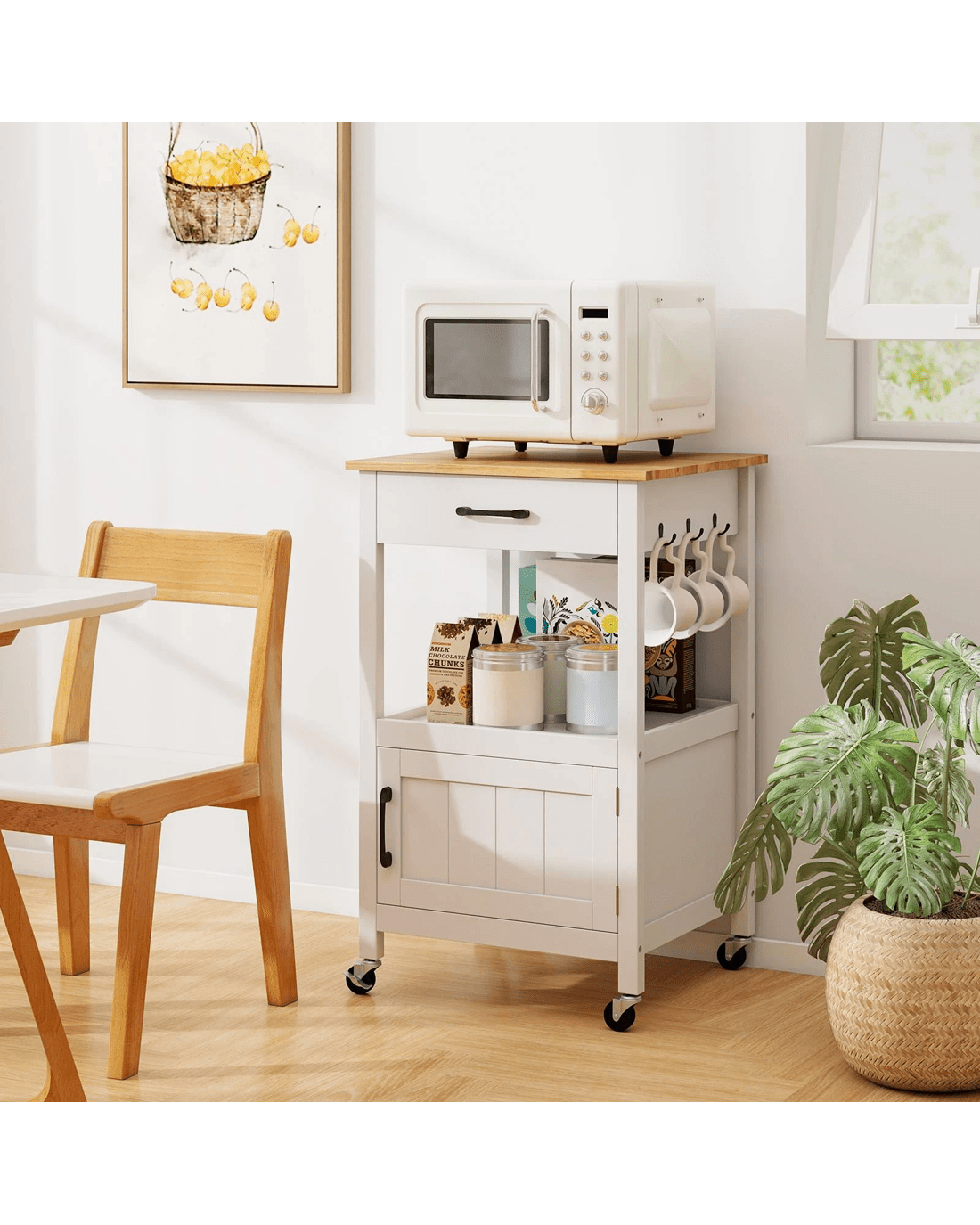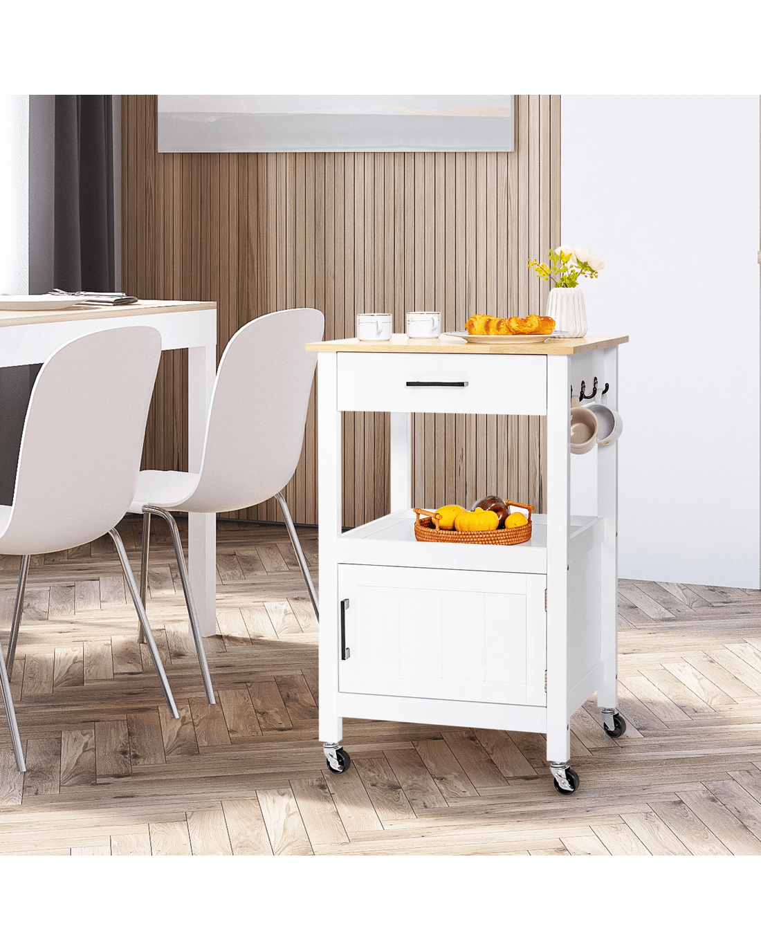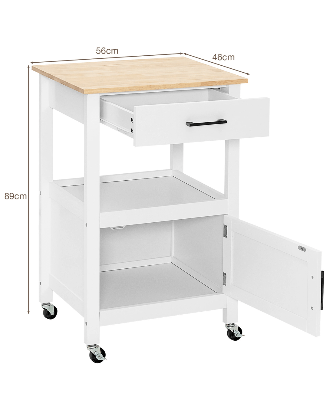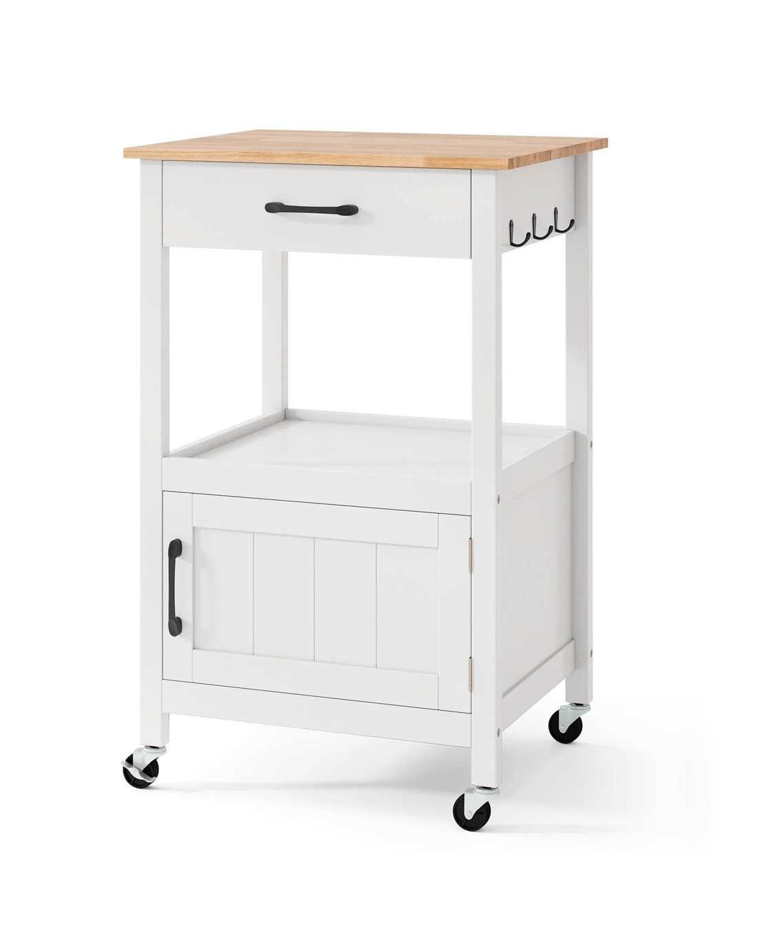 Our small kitchen island cart is a perfect storage solution for narrow spaces. It has 1 sliding out drawer under the top, 1 open shelf in the middle and 1 door cabinet on the bottom, allowing you to better organize different stuff. Besides, 3 handy hooks on right side can be used to hang rags or kitchen utensils. The rubber wood countertop is durable and easy to clean. What's more, 2 unlockable wheels and 2 lockable wheels help you to easily move it and fix it in position. And the casters with metal brakes is not easy to crack. To offer more convenience, we also design it with convenient handles, useful catch and premium hinge. In addition, the kitchen island is easy to assemble with clear instruction and complete accessories.