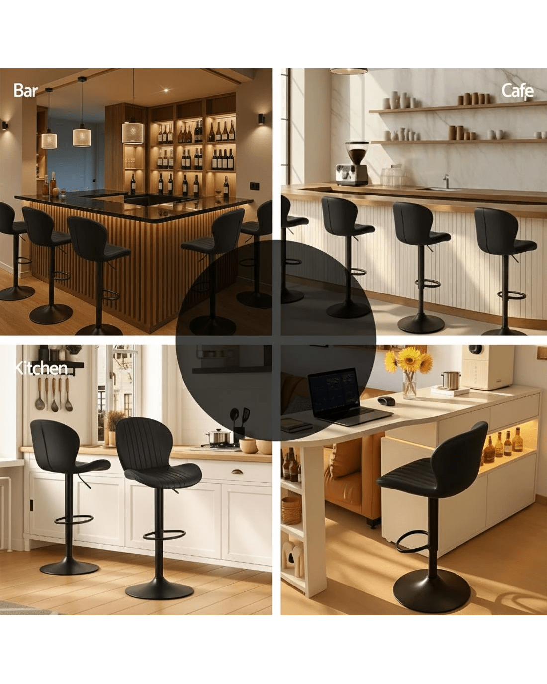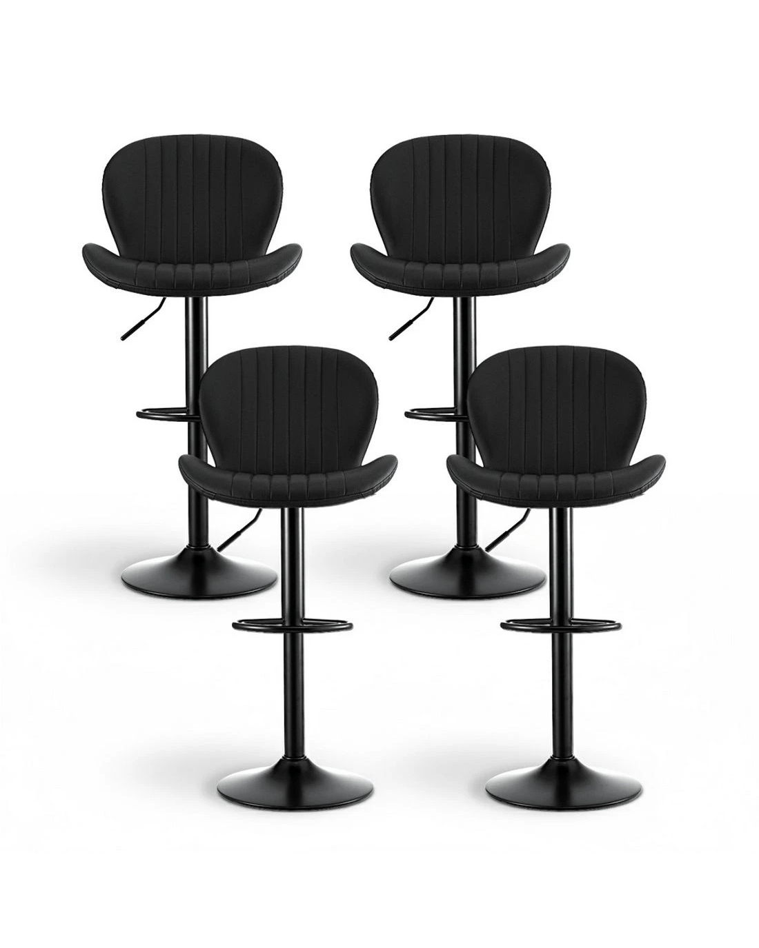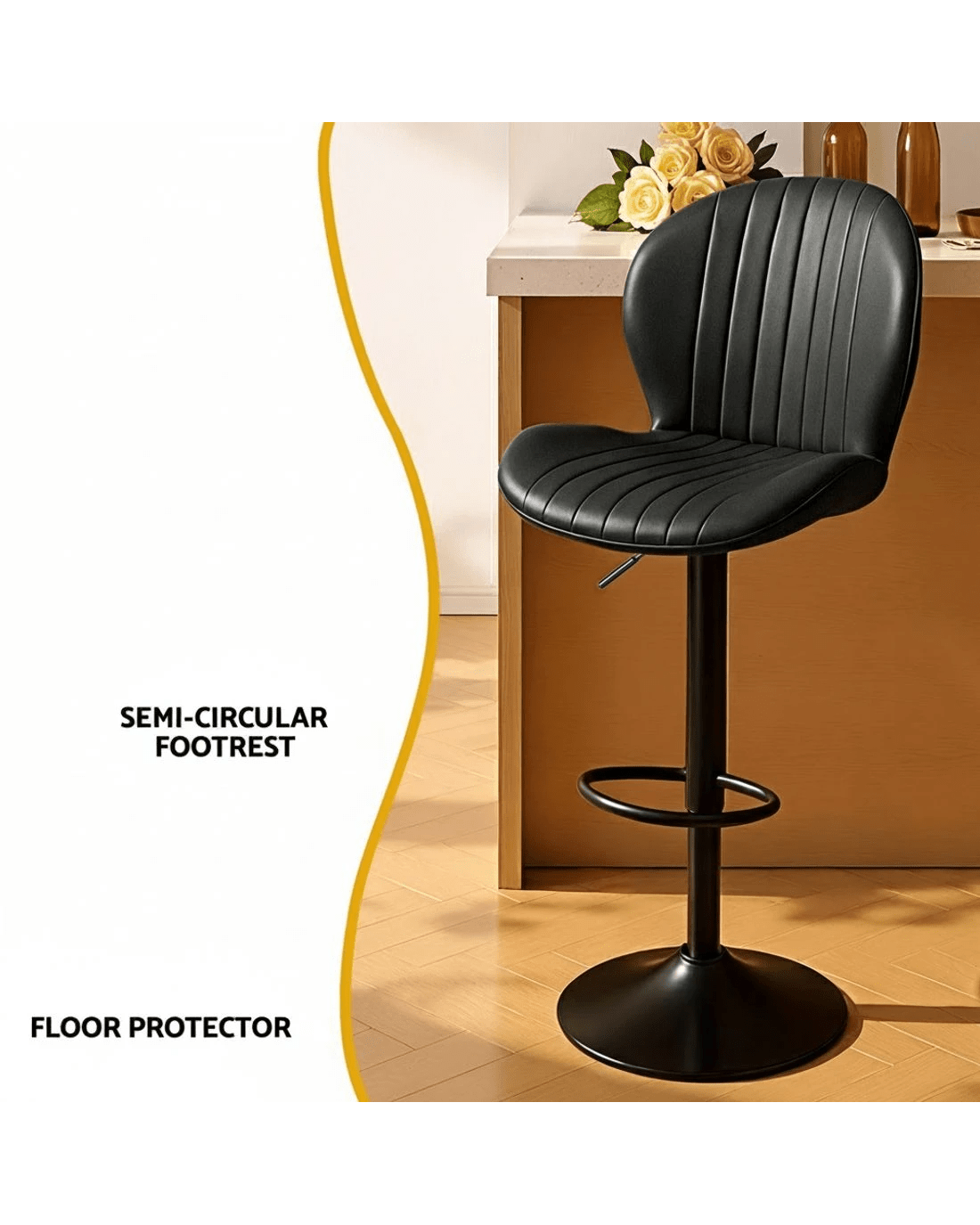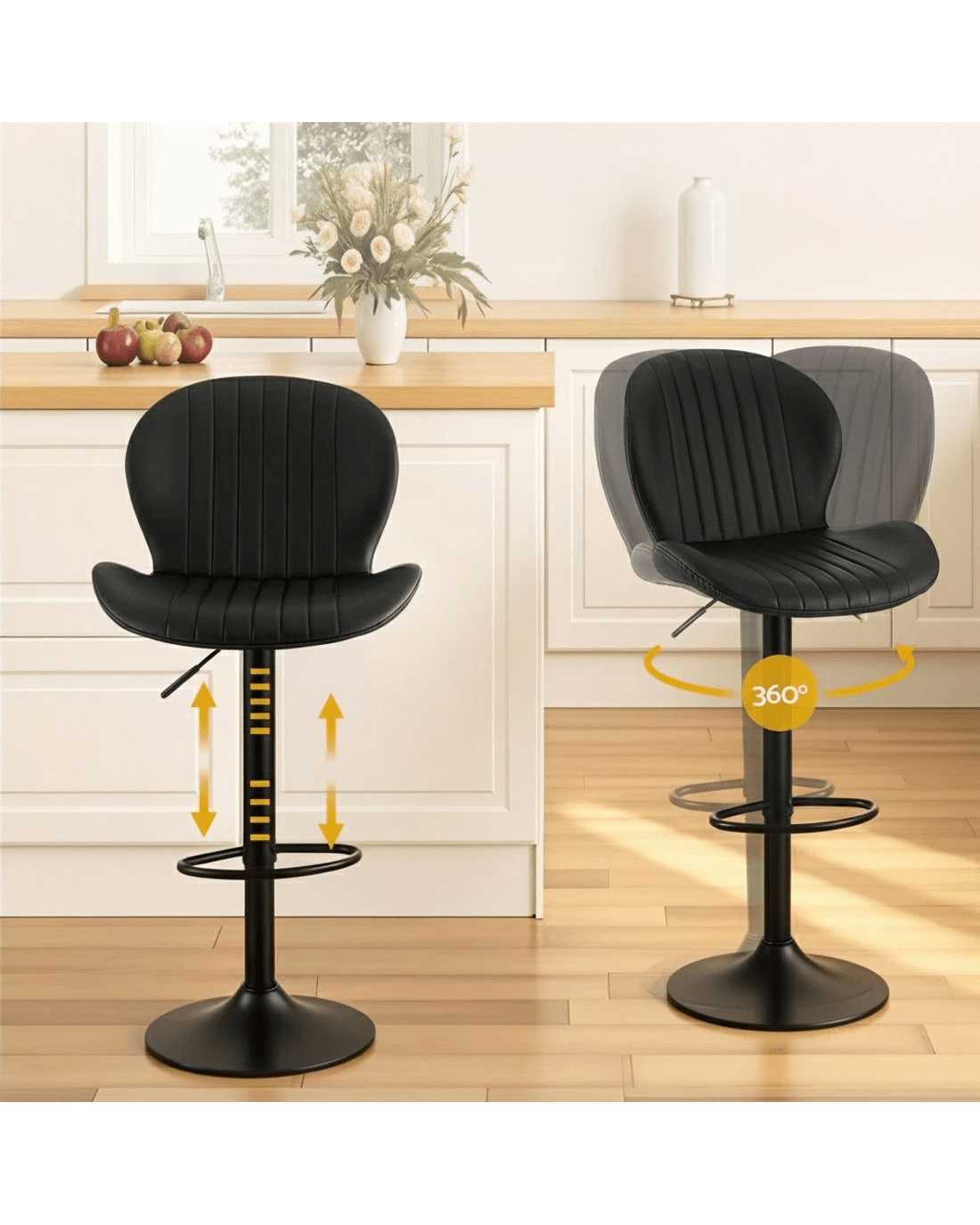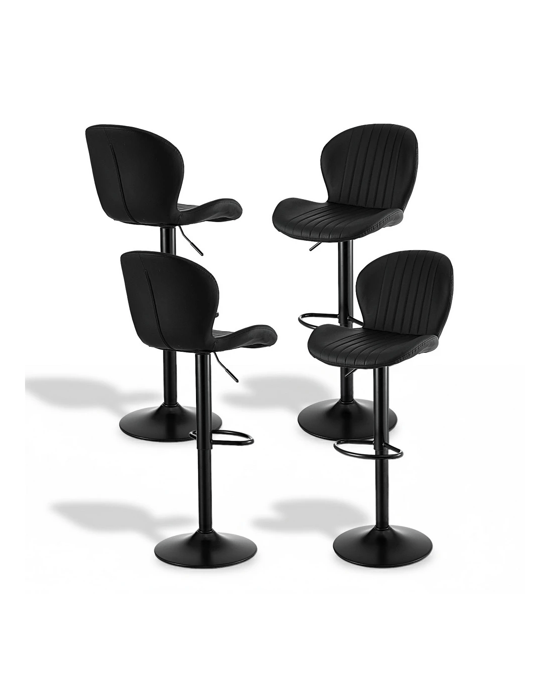 This set of 4 premium bar stools combines modern aesthetics with practical features. Upholstered in black PU leather, the contoured shell-shaped seats with a vertical stripe pattern offer both comfort and style. The adjustable height (95–113cm) makes these stools versatile for various counter or bar setups. Built with a sturdy metal frame, reinforced gas lift cylinder, and 120kg weight capacity per stool, they are designed for durability and stability. Anti-slip floor protectors and a semi-circular footrest ensure safety and comfort, while easy assembly saves you time. Perfect for kitchens, dining areas, or commercial spaces, these stools are a must-have for any modern interior.