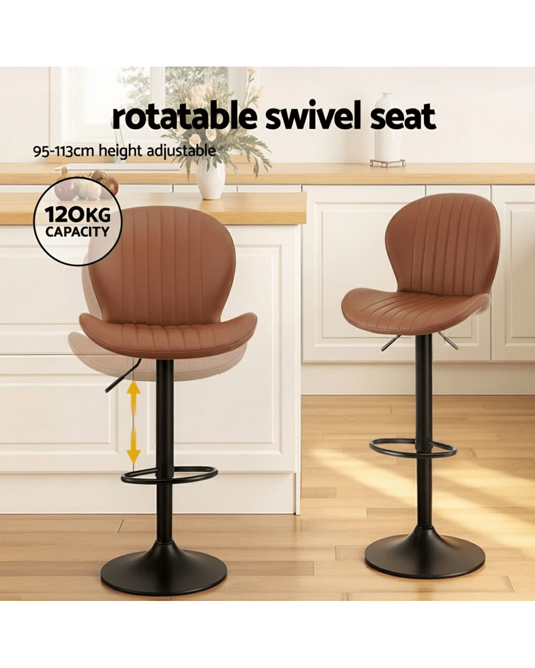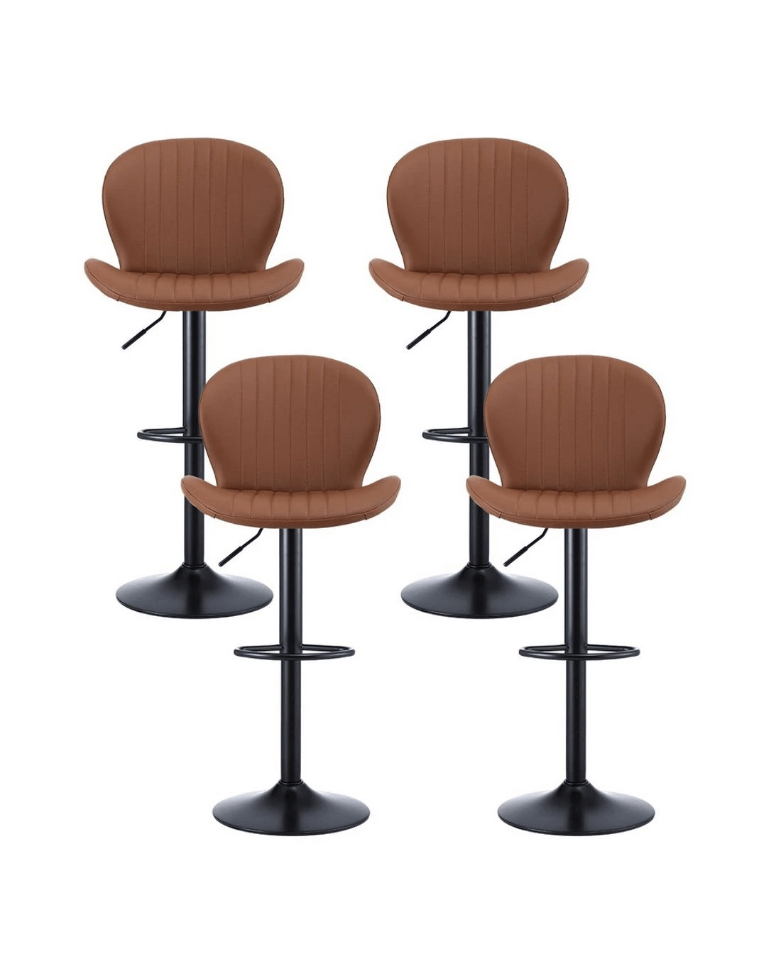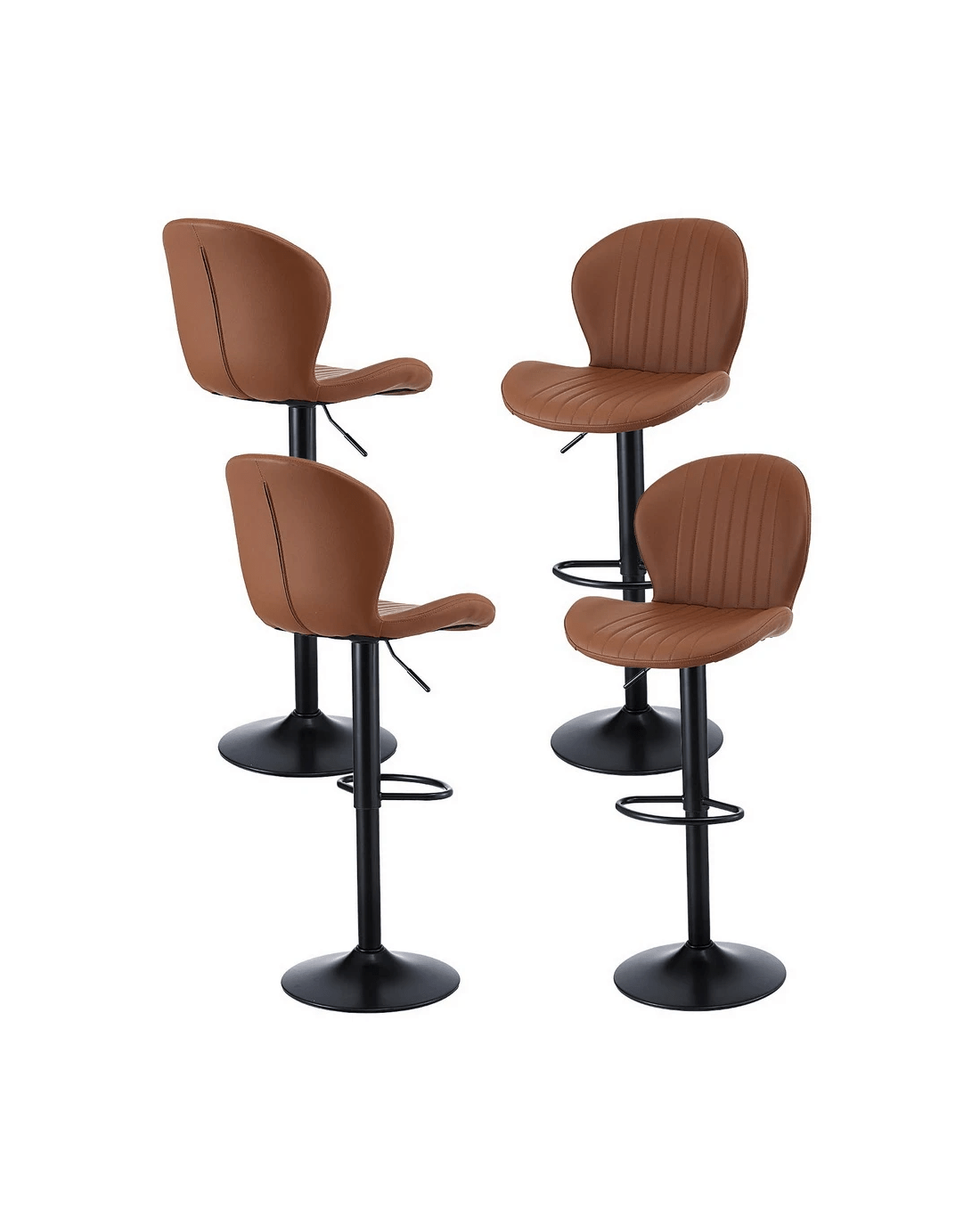 This set of 4 premium bar stools combines modern aesthetics with practical features. Upholstered in brown PU leather, the contoured shell-shaped seats with a vertical stripe pattern offer both comfort and style. The adjustable height (95–113cm) makes these stools versatile for various counter or bar setups. Built with a sturdy metal frame, reinforced gas lift cylinder, and 120kg weight capacity per stool, they are designed for durability and stability. Anti-slip floor protectors and a semi-circular footrest ensure safety and comfort, while easy assembly saves you time. Perfect for kitchens, dining areas, or commercial spaces, these stools are a must-have for any modern interior.