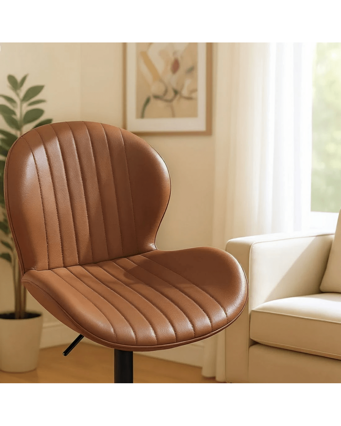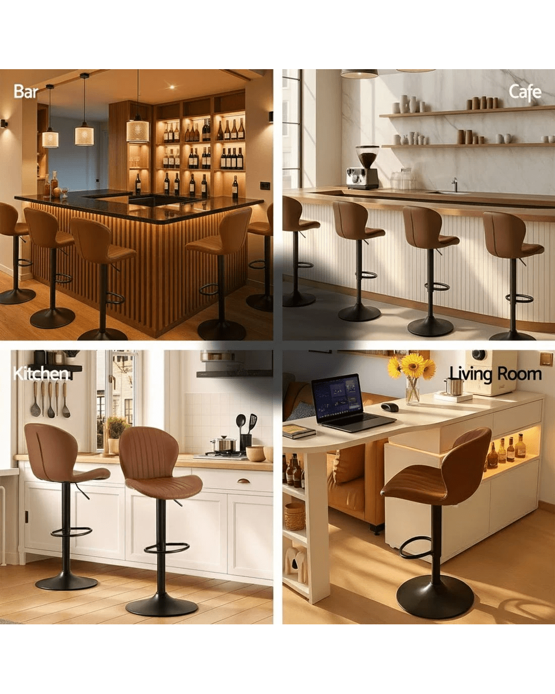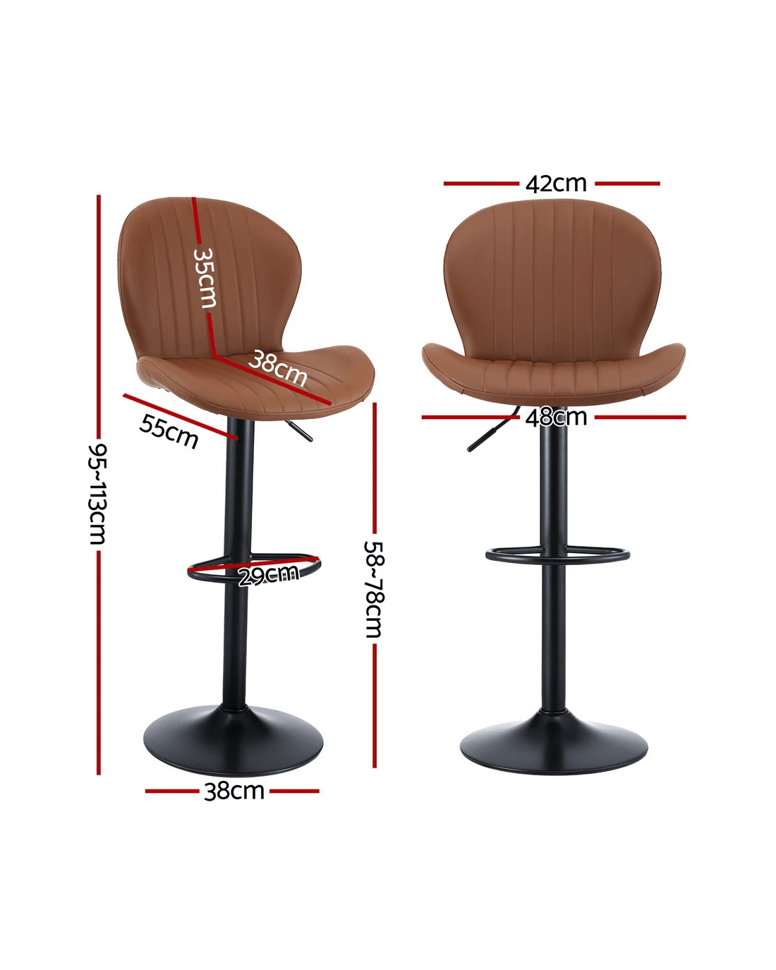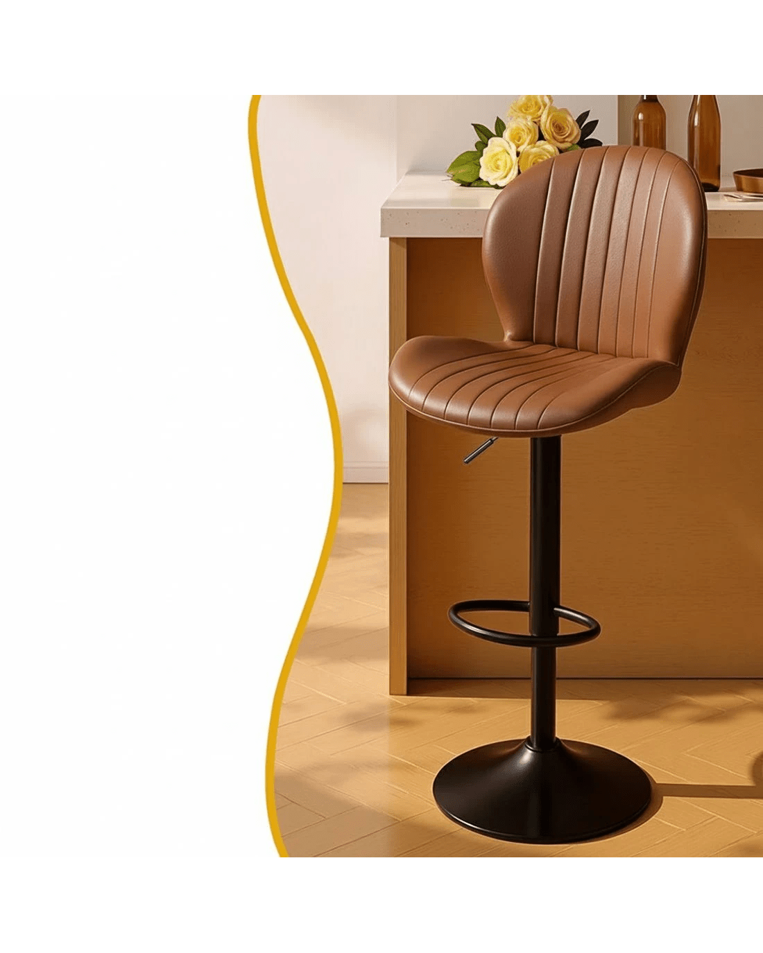 This set of 4 premium bar stools combines modern aesthetics with practical features. Upholstered in brown PU leather, the contoured shell-shaped seats with a vertical stripe pattern offer both comfort and style. The adjustable height (95–113cm) makes these stools versatile for various counter or bar setups. Built with a sturdy metal frame, reinforced gas lift cylinder, and 120kg weight capacity per stool, they are designed for durability and stability. Anti-slip floor protectors and a semi-circular footrest ensure safety and comfort, while easy assembly saves you time. Perfect for kitchens, dining areas, or commercial spaces, these stools are a must-have for any modern interior.