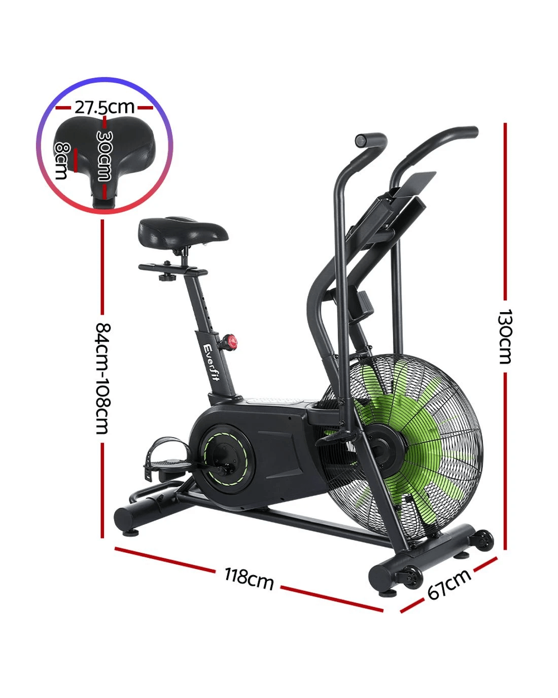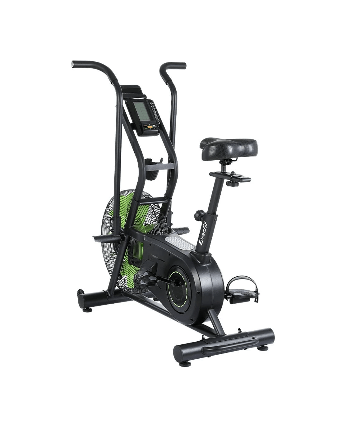 Never miss a workout with an Everfit Air Bike. Our gym-quality equipment fits perfectly in your home, helping you achieve your fitness goals one day at a time. This dual-action exercise bike features an air resistance system with a 4.6kg heavy-duty steel flywheel and dynamic moving arm cranks for a full-body workout. Adjust the thick padded seat horizontally, vertically, backwards and forwards for the ideal fit. The digital display track multiple fitness parameters where you can see them. Non-slip pedals with protective straps keep your feet firmly in place, while built-in wheels make the bike easy to move. Best of all, an in-built phone/tablet holder allows you to watch your favourite movies, shows or workout mixes as you exercise. So what are you waiting for? Start your very own home gym today with an Everfit Air Bike.