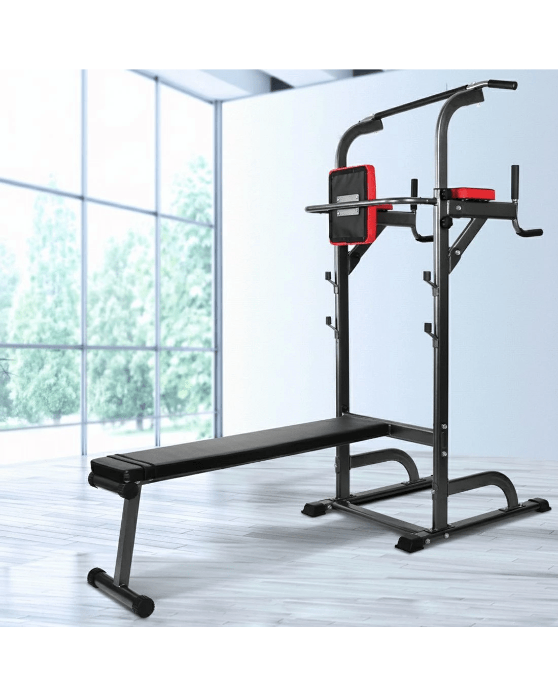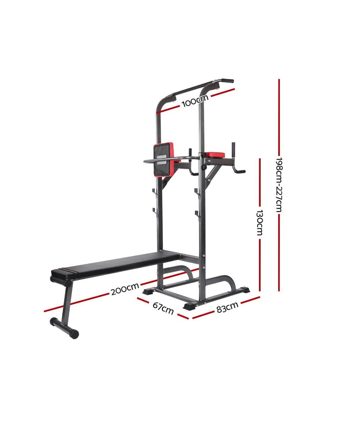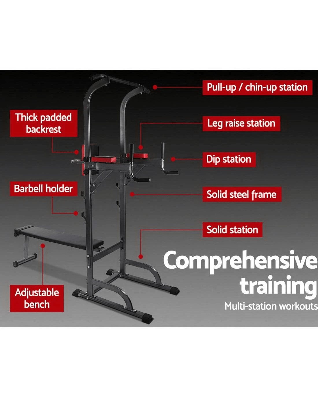 Forget about the gym. Bring the gym to your home with the Everfit Multi-function Gym. This 8-in-1 workout station is all you need for a great total body workout, offering a huge range of exercises for your upper body and core. It offers a range of exercises such as bench presses, chin ups, dips, pull-ups, weight lifts, leg raises, push-ups and more. Fact is, there is so much you can workout to with this versatile tower of power to push your body to its limits with results that matter. Constructed from heavy-duty, powder-coated tubular steel, the gym station is durable and strong and features large, non-slip rubber feet that will prevent unwanted movement, high-density and sweat-proof cushioning and padded handles and arm supports for truly safe and comfortable training regimes.