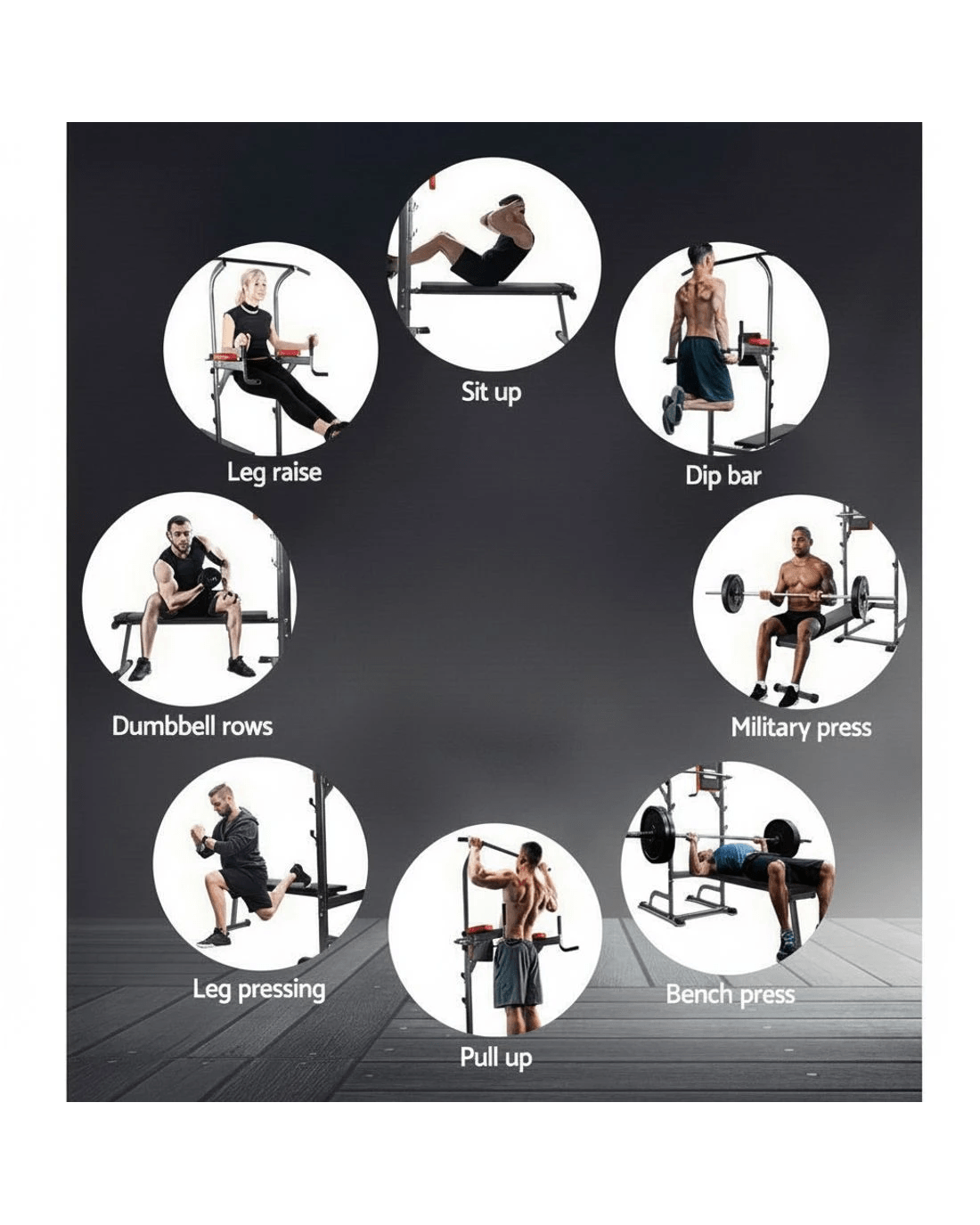 Stations: Bench Press, Chin Up, Dip Station, Pull-up, Power Rack, Leg Raise, Push-ups