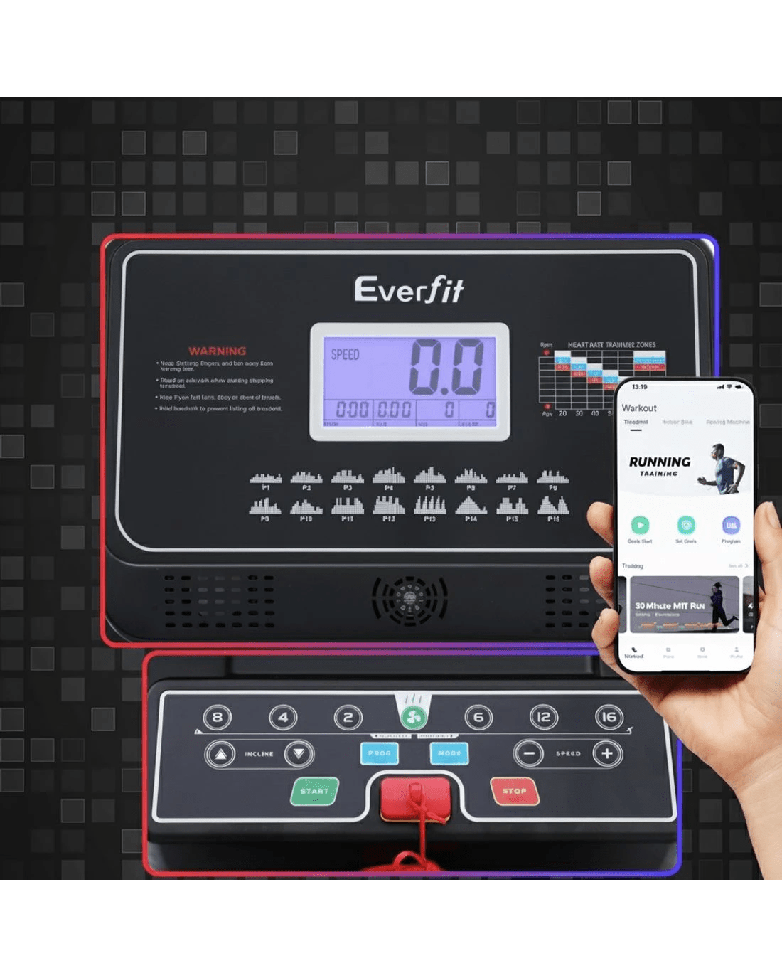 Introducing our premium Everfit treadmill with a robust composite running board and strong powder-coated steel frame. Featuring a user-friendly control panel, clear digital LCD display, high-performance motor, and durable running belt. Enjoy automatic incline, shock absorption, heart rate monitoring, and Bluetooth connectivity.