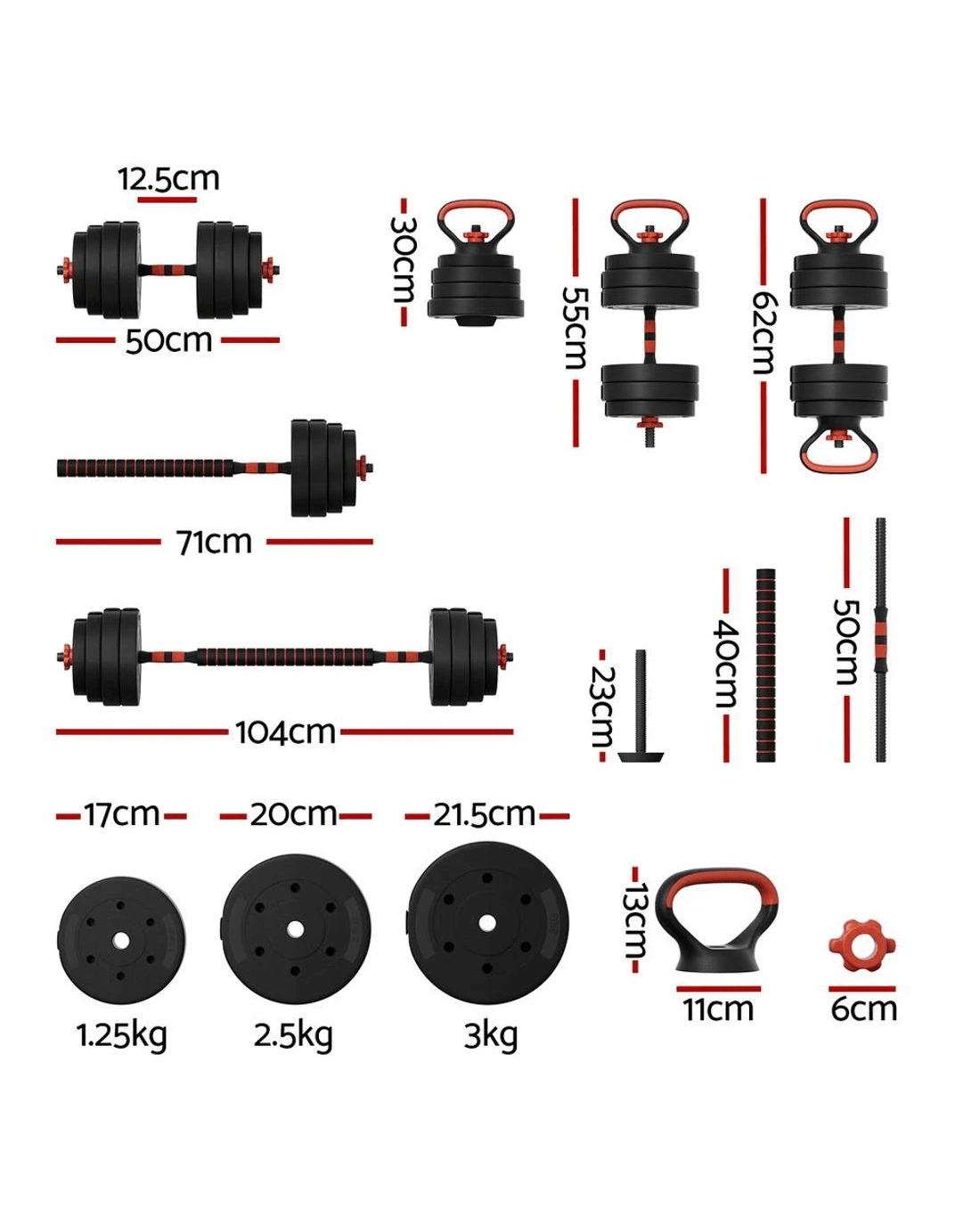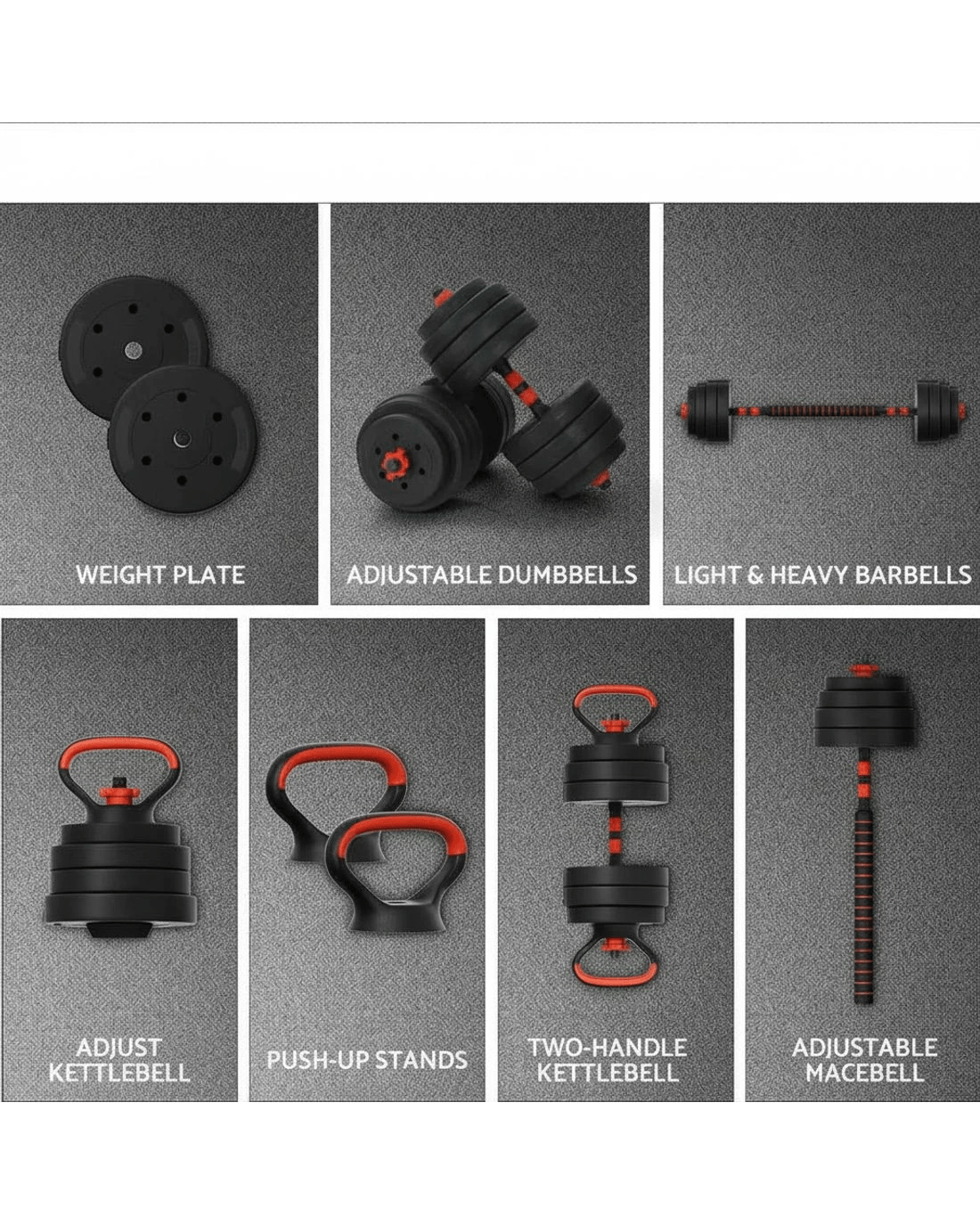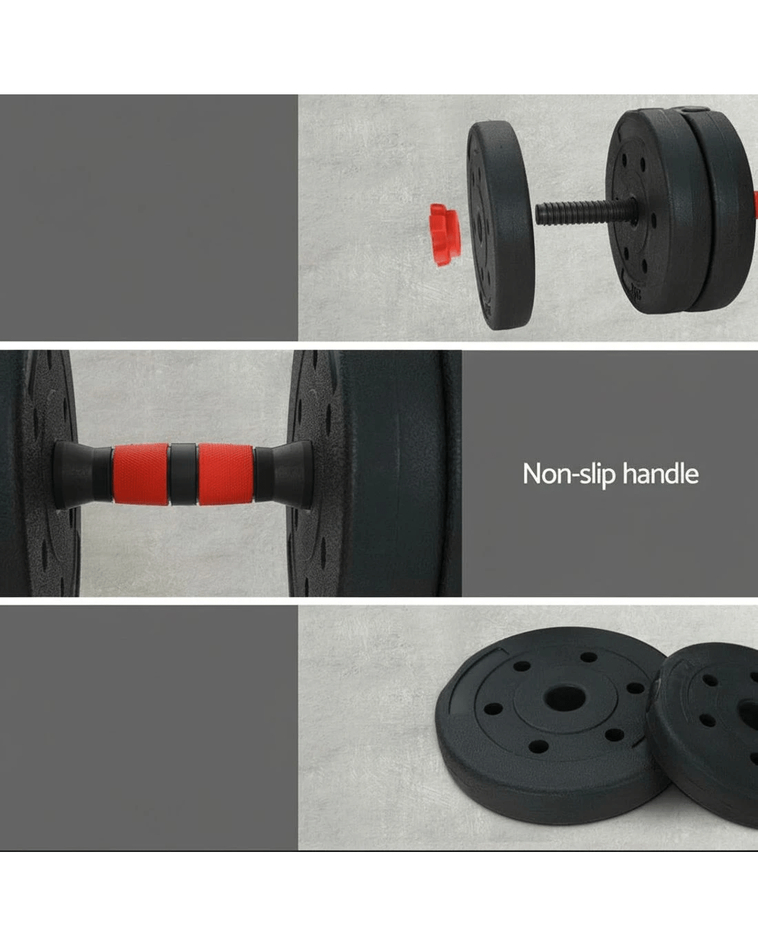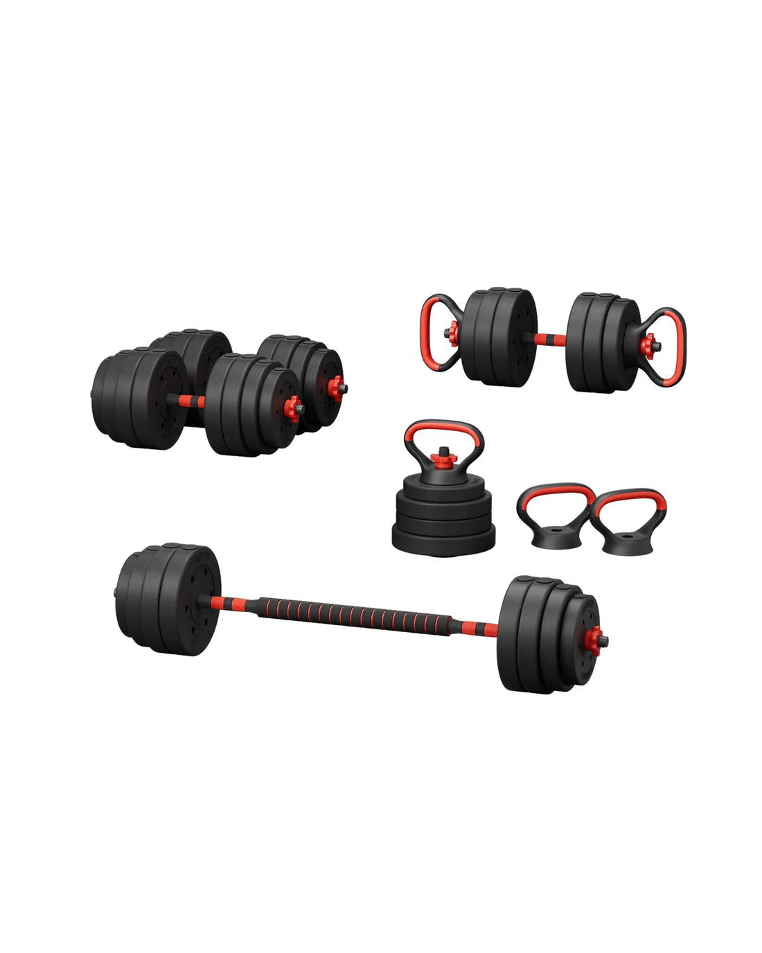 For a versatile weightlifting workout, the Everfit 7-in-1 Weight Set is an ideal fitness companion. The set comes with all the connections and attachments you need to use the weights in a variety of ways: as dumbells, barbells, kettlebells, push-up stands and standard weight plates. The weight plates are easy to attach and remove, so you can adjust your weights to your exact fitness specifications – up to 40kg. With a foam-covered barbell bar and non-slip dumbbell handles, the weights are easy to grip and comfortable to hold throughout the exercise. The set is simple to assemble and store, so you can easily incorporate the set into your daily routine without taking up space. Our versatile set is ideal for home gym junkies interested in weight loss, strength training, endurance training, muscle gain and general cardiovascular performance. For a comprehensive workout without leaving the gym, Everfit has you covered with our 7-in-1 Weight Set.