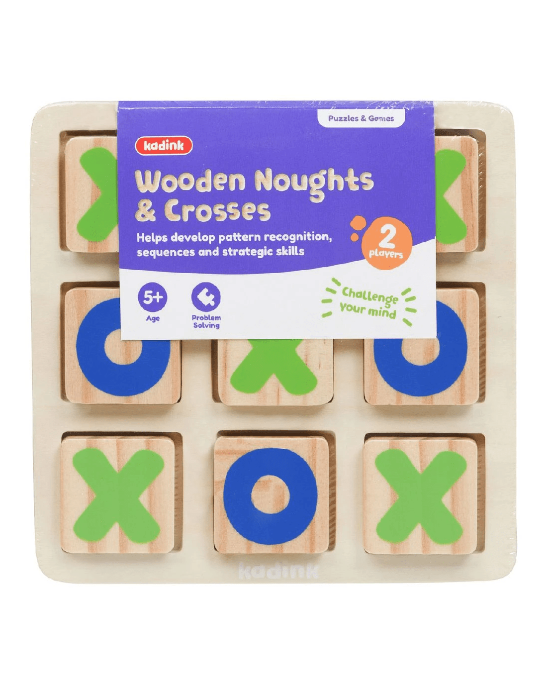 This Kadink Wooden Noughts & Crosses set is a fun 2 player game that can help develop pattern recognition as well as sequence and strategic skill. With 10 wooden tiles and a wooden playing board, it is a simple yet enjoyable way to challenge your mind as you challenge your friends.