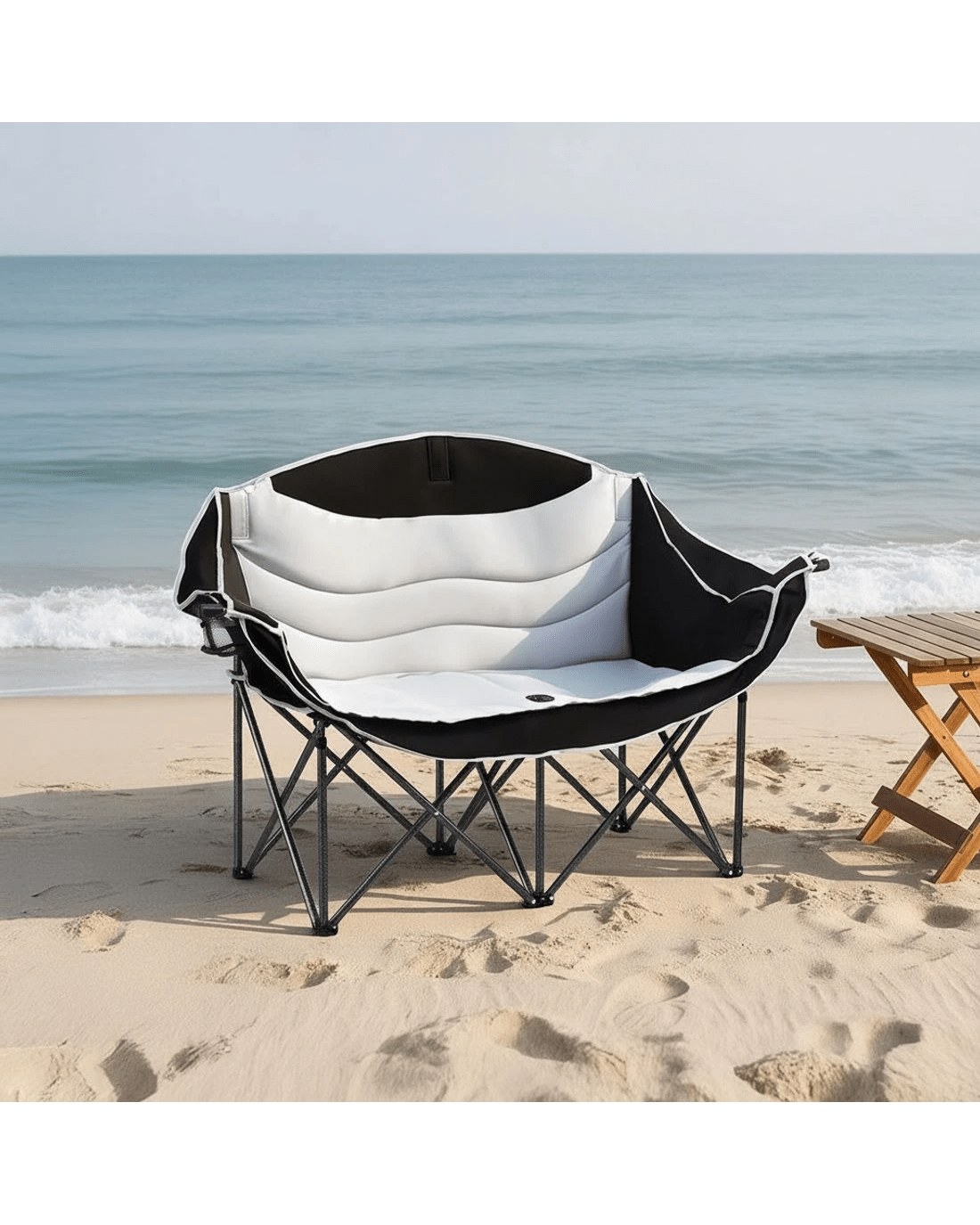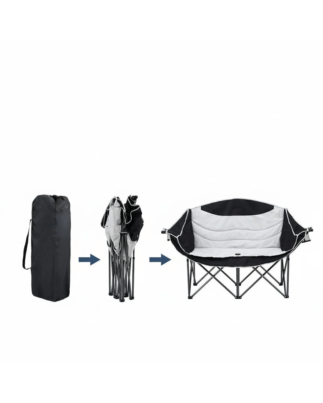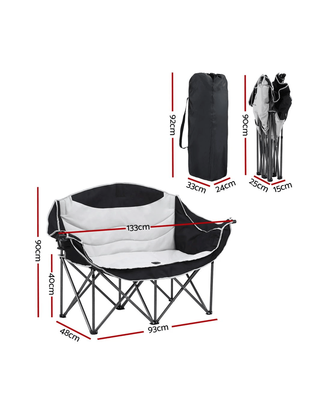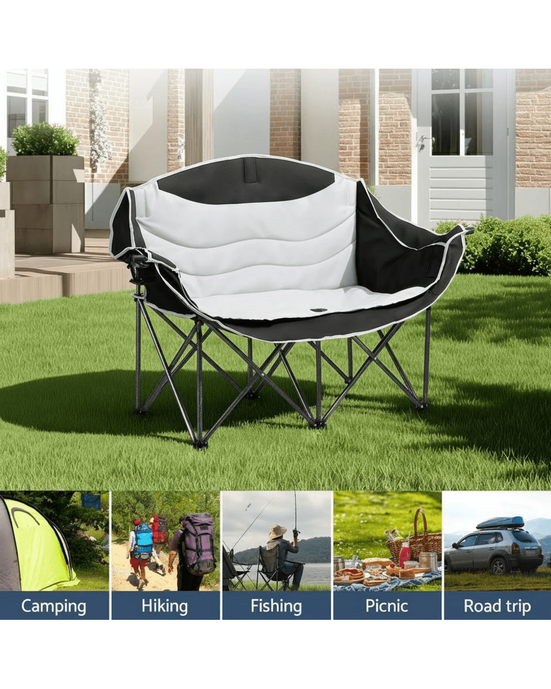 The Weisshorn Folding Double Moon Chair is built for comfort, strength and convenience, offering extra space so two people can relax together. With its spacious curved seat design, this two-seater chair provides ergonomic support and a cosy feel, making it far more inviting than standard camping chairs. Crafted with a reinforced iron frame, it delivers reliable stability and supports up to 240kg, ensuring secure seating for shared use. The seat is made from water-resistant and breathable 600D Oxford fabric, combining toughness with lasting comfort, while helping to handle light outdoor moisture and airflow during long hours of sitting. Practical touches add more value, including a built-in drink holder to keep beverages close at hand and a carry bag that makes storage and transport effortless. Despite its strong build, the chair remains lightweight, folds down compactly, and requires no assembly, meaning you can set it up or pack it away in seconds. Perfect for camping, fishing, festivals, beach trips, picnics or simply unwinding in your backyard, the Weisshorn Double Moon Chair is a versatile two-seater that balances comfort, practicality and durability, ensuring you always have a reliable spot to share and enjoy the outdoors.