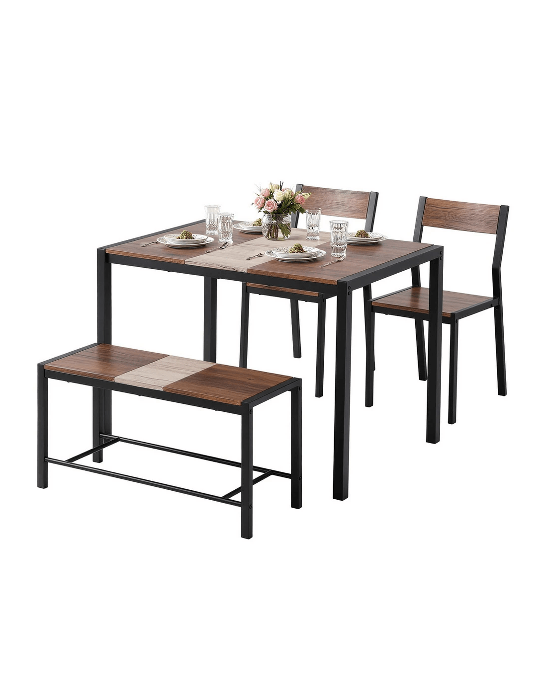 The set includes a spacious tabletop, two stable chairs, and a comfortable bench, easily seating four people. The surfaces are finished in a modern, multi-toned design featuring Rustic Brown, Beige, and Black accents for a contemporary look.