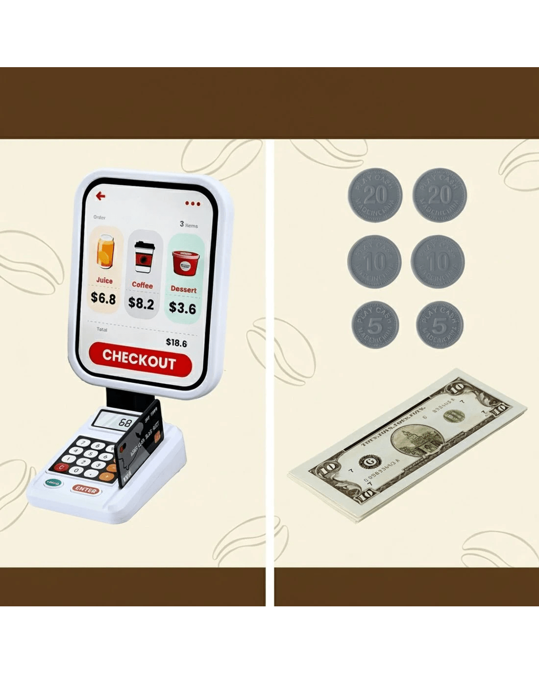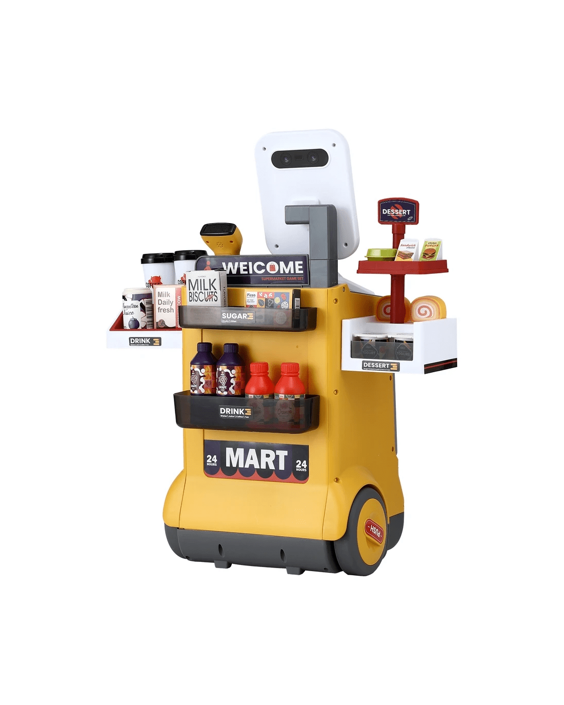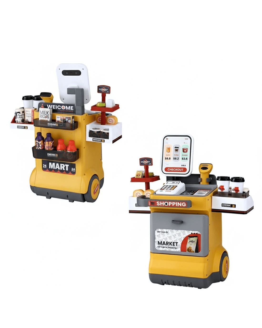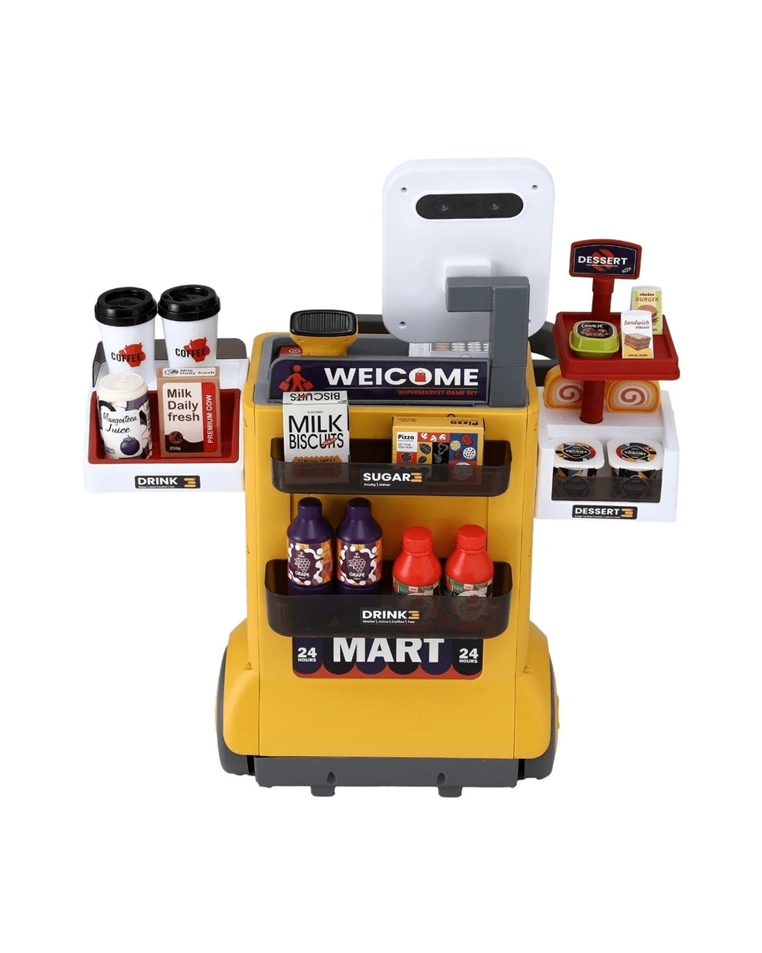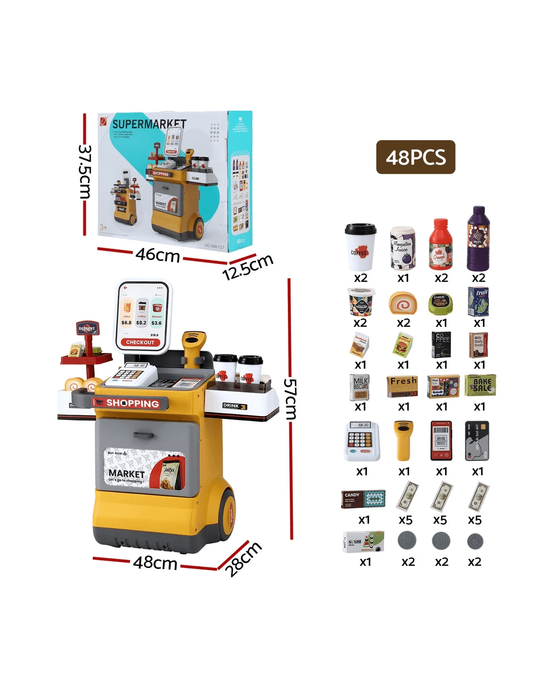 Featuring a colourful supermarket pretend play set with 48pcs accessories, this pretend play set is perfect for kids to perform shopping role plays with friends and parents. The play set comes with a mini barcode scanner with sound and lighting features; just like a real one! While the play set provides plenty of fun during play, it is also an excellent educational learning play set for kids; encouraging teamwork, communication, expression and logic exercises. Let's bring this fun and creative supermarket pretend play set home for your loving ones.