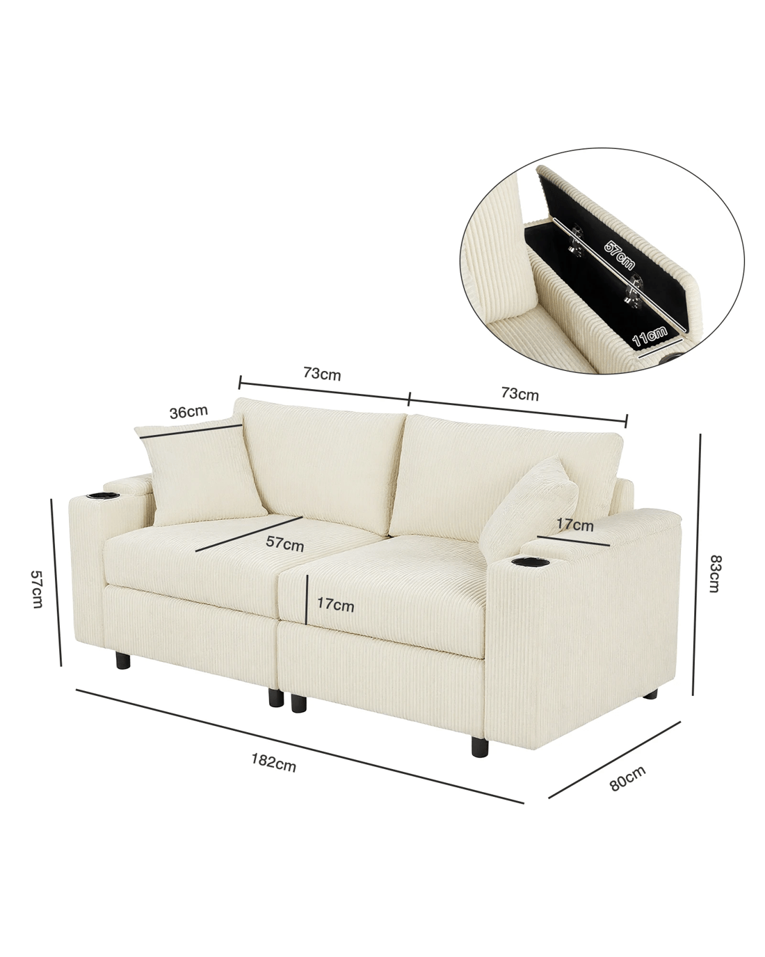 Sold by AdvwinAdvwin 182cm 2 Seater Sofa Corduroy Modular Lounge Couch w/ Storage Armrests & Cup Holder
