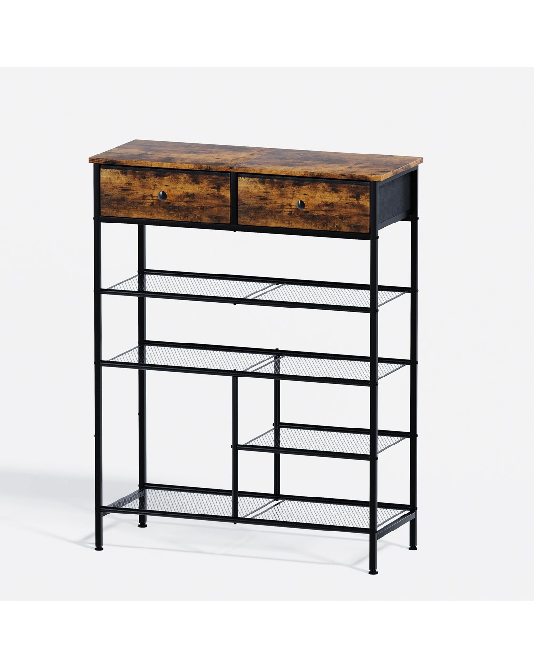 Maximize your entryway space with this versatile 4-tier shoe rack. It features two practical fabric drawers for storing small essentials, spacious shelves for a variety of shoes, and a dedicated compartment for boots. Constructed from durable metal and particleboard, it combines sturdiness and reliability with a modern style. Perfect for your entryway, living room, or bedroom, it can organize everything from footwear accessories to books and decorative items. Easy to assemble and featuring an anti-tip safety feature, it's the perfect addition to your home's organization.