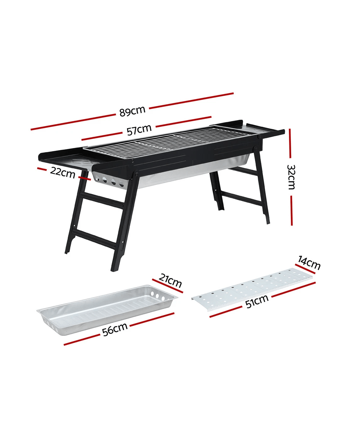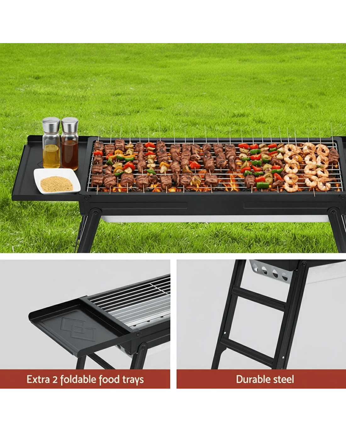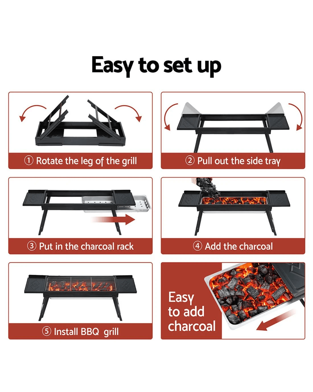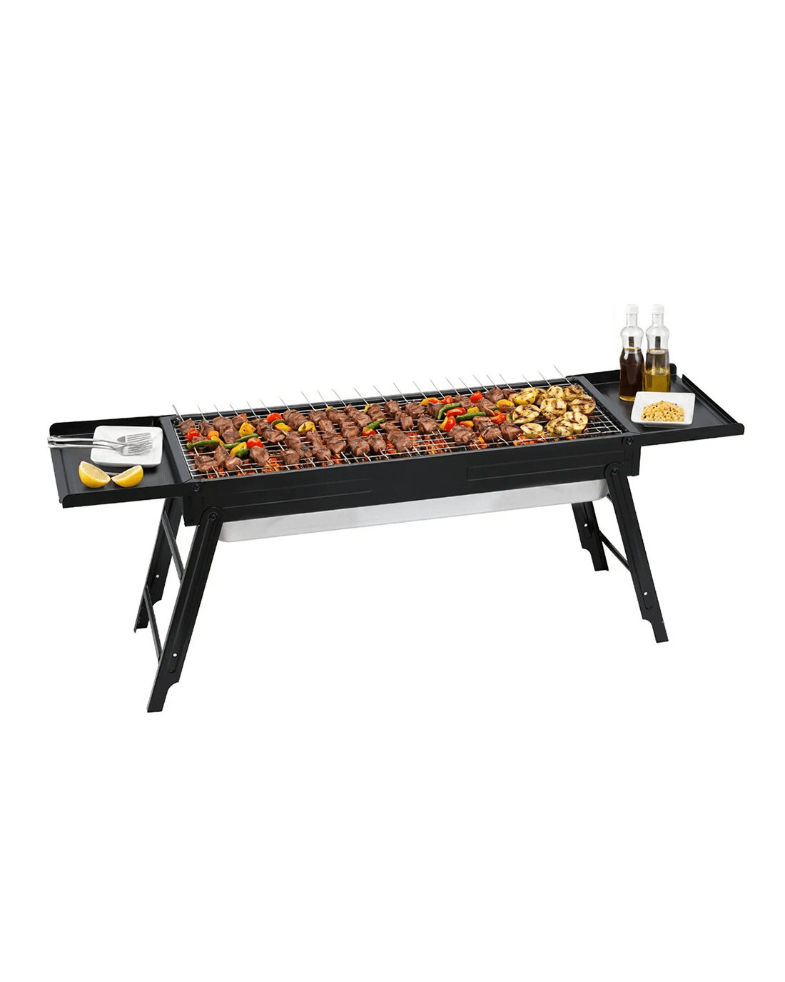 What could be better than an outdoor BBQ in the summer? The Grillz Foldable BBQ Grill is the product to have this season, whether you're planning an outdoor feast or you need a quick cooking solution on outdoor. It features a durable black steel base with food-grade stainless steel racks for delicious grilled meat and vegetables. Plus, two extra food trays for placing condiments, food. It includes a removable ashtray for easy cleaning and maintenance. It ensure good ventilation at the bottom that allows oxygen to flow in and feed the fire. Get your grill on this summer with a Grillz Foldable BBQ Grill!