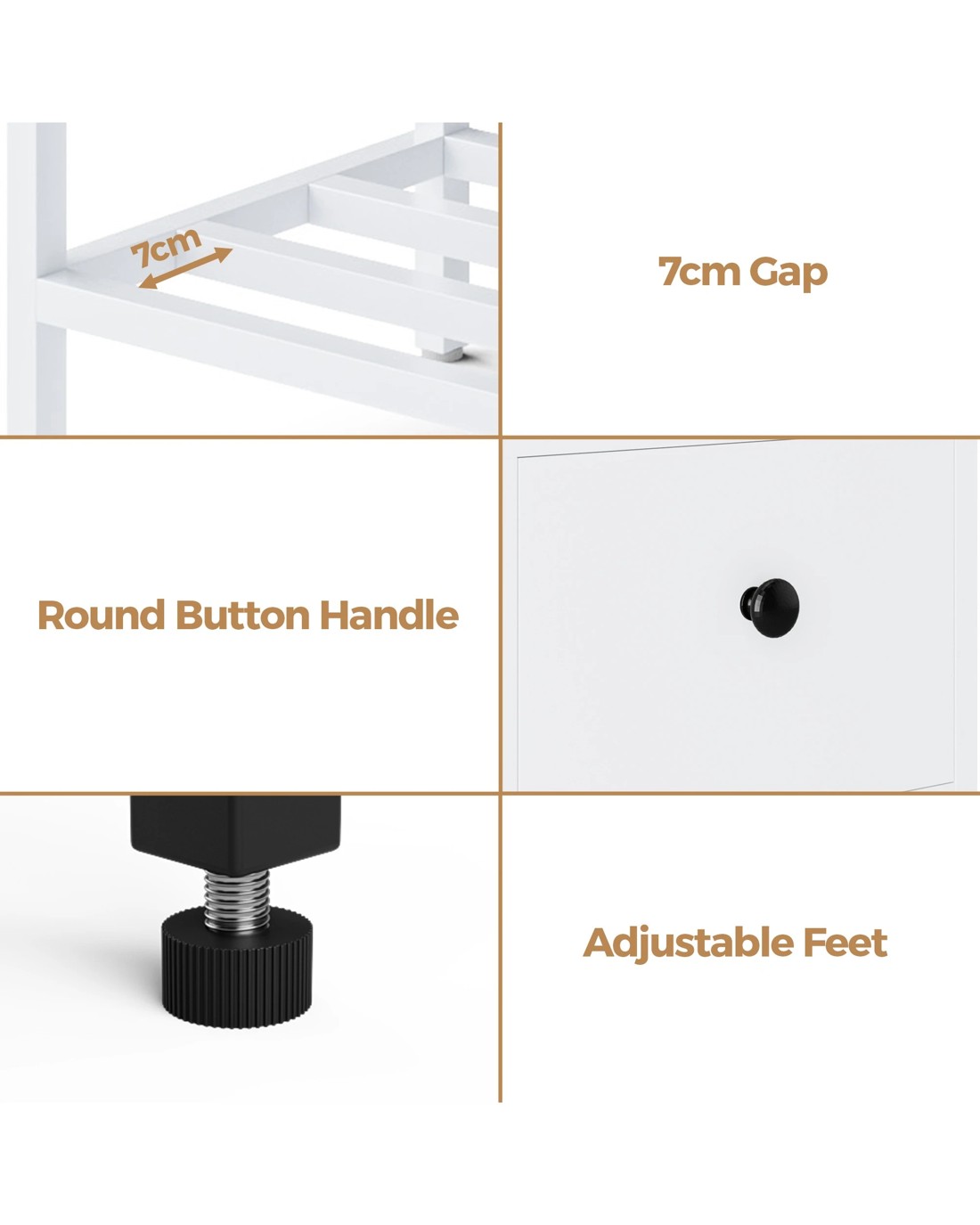 Featuring a flip-top hidden storage box, two drawers, and a convenient side hook, this multifunctional unit neatly organizes everything from blankets to keys and umbrellas. The ventilated metal shelf holds around 5 pairs of everyday shoes, while the hidden bottom space stores up to 5 pairs of slippers (depending on shoe size).