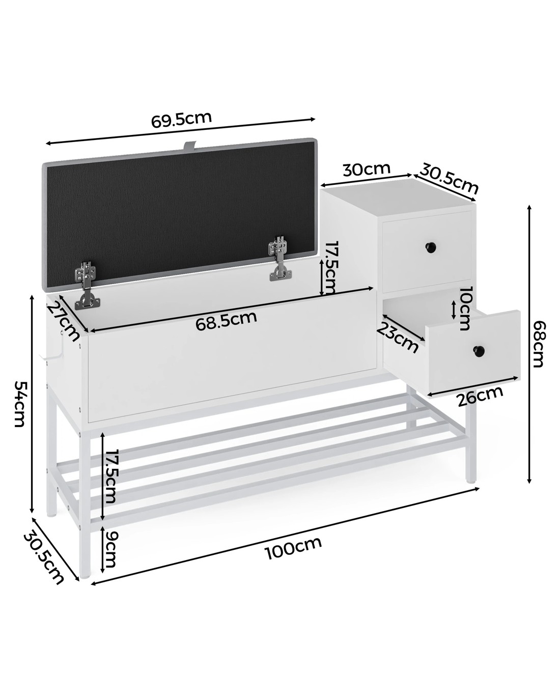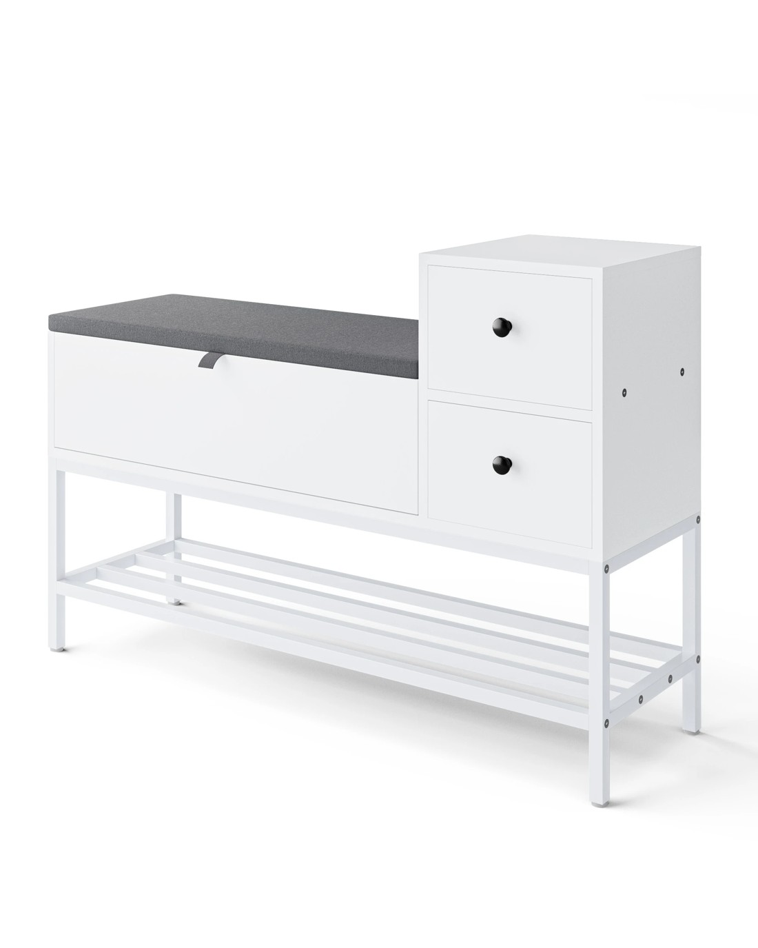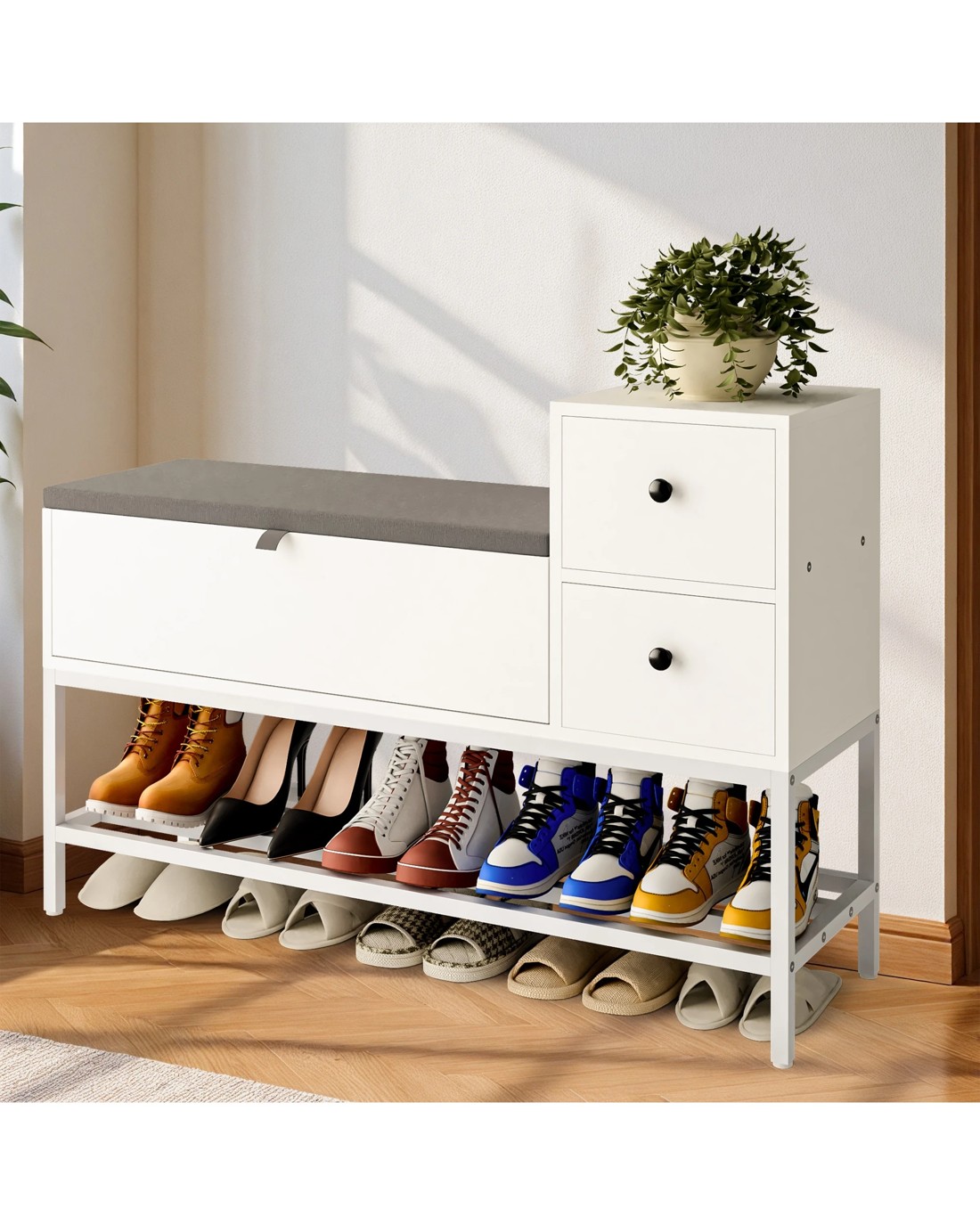 【Versatile Storage Bench】: With a flip-top storage box, two drawers, and a side hook, this unit stores everything from blankets and foldable umbrellas to keys. The ventilated metal shelf holds about 5 pairs of shoes, with space below for 5 pairs of slippers (depending on shoe size)—keeping your entryway neat and organized.