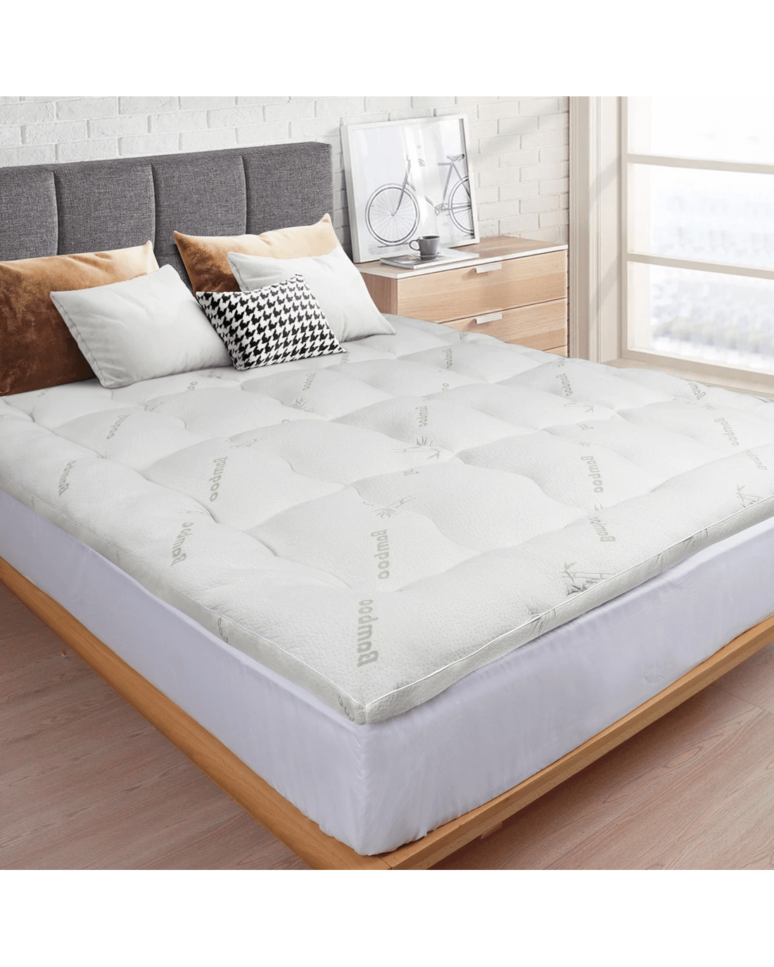 Our mattress topper is filled with eco-friendly bamboo microfibre filling and brings comfort without odours and allergens. Plus, the naturally breathable and moisture-wicking cover is hypoallergenic. It's easy to enhance your comfort or upgrade the experience of an old mattress with our topper. The 45cm fitted skirt keeps the topper firmly in place and smoothly attached to your mattress despite tossing and turning through the night, decreasing tangled mess in the morning.