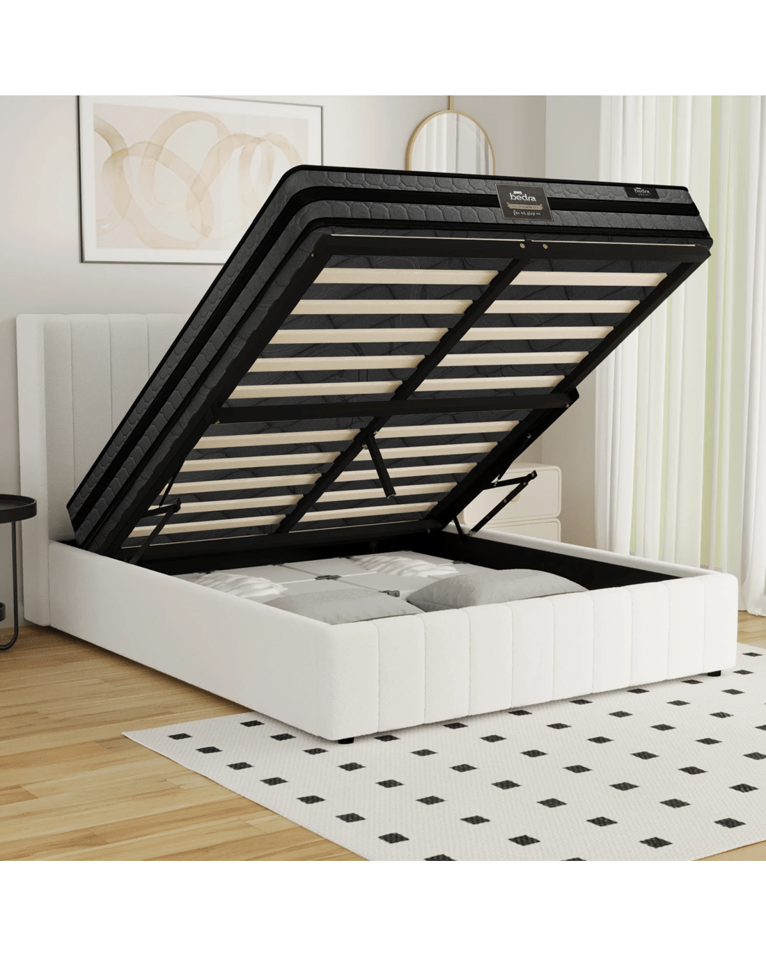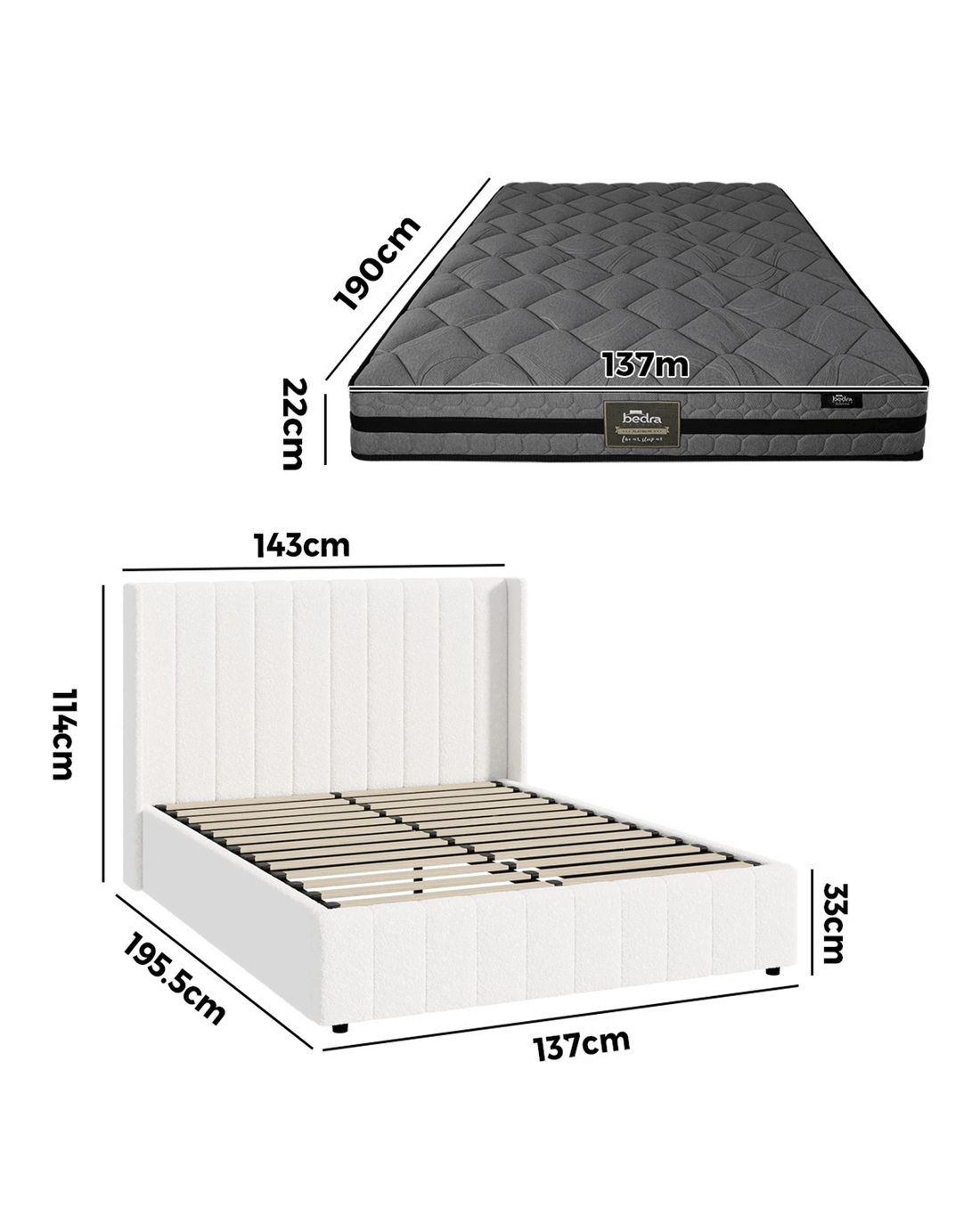 Sold by Kamprad's Oikos 1943Oikiture Bed Frame Double Size Gas Lift Storage Boucle Beds W/ Mattress Set BILY - White