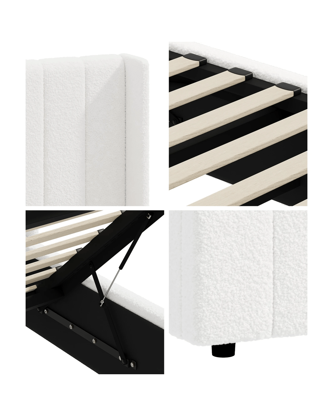 Featuring a well-padded winglet bedhead and bed end design with premium boucle fabric upholstery, the Oikiture Gas-Lift Bed Frame exudes bespoke elegance and adds a luxurious presence to any bedroom decor. Soft to the touch that lends a swank and intimate aura to accompany your calm and restful sleep.