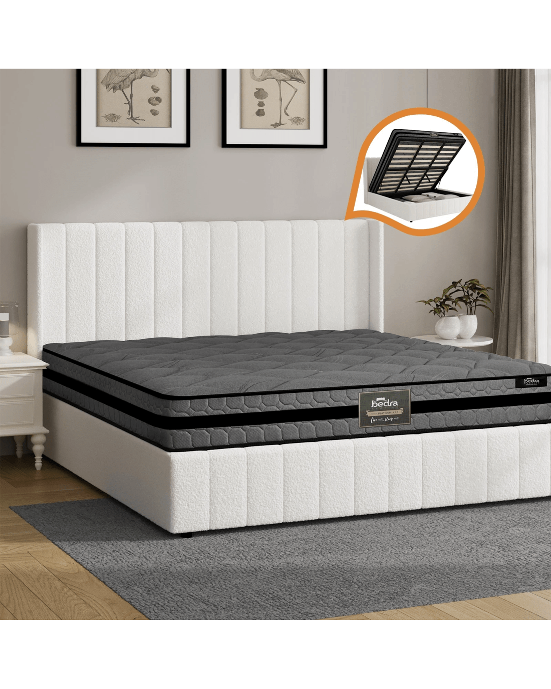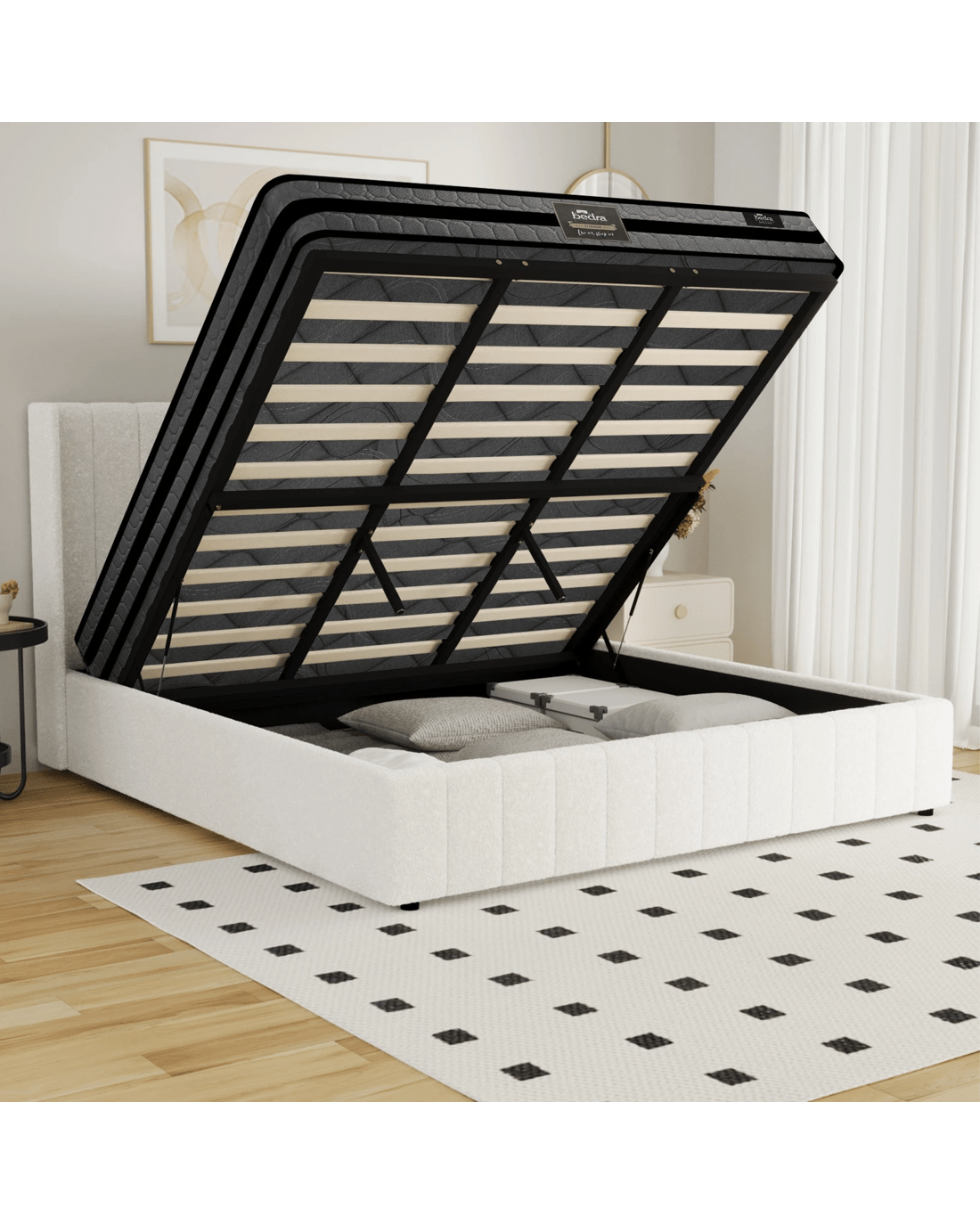 Sold by Kamprad's Oikos 1943Oikiture Bed Frame King Size Gas Lift Storage Boucle Beds W/ Mattress Set BILY - White