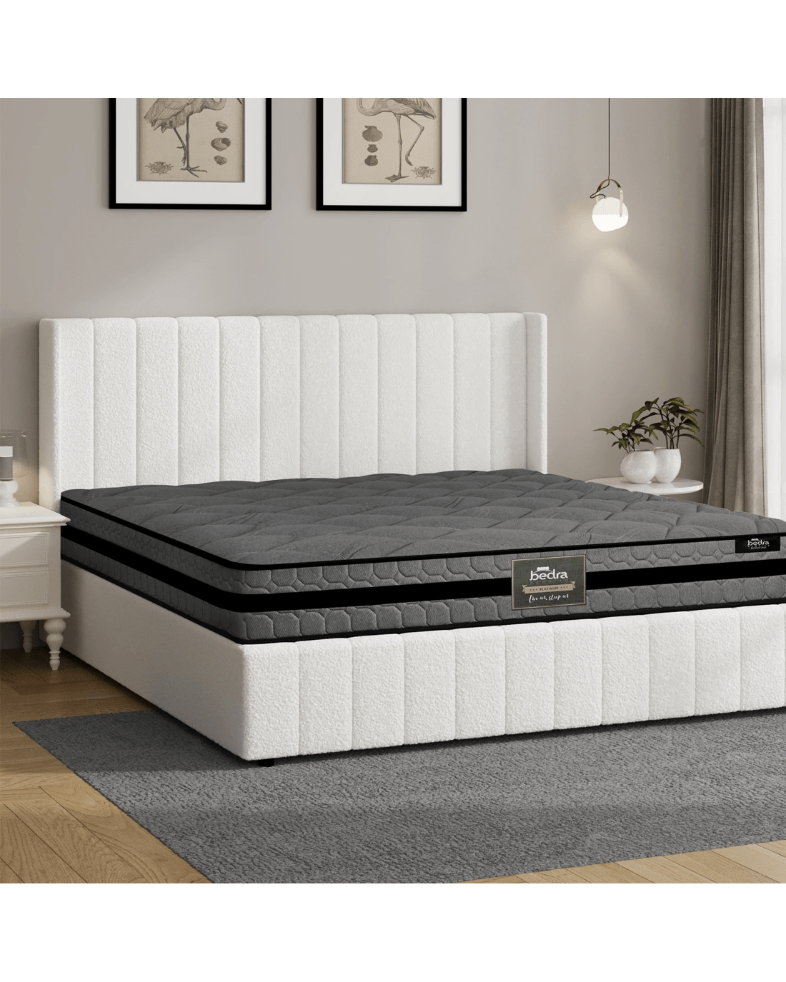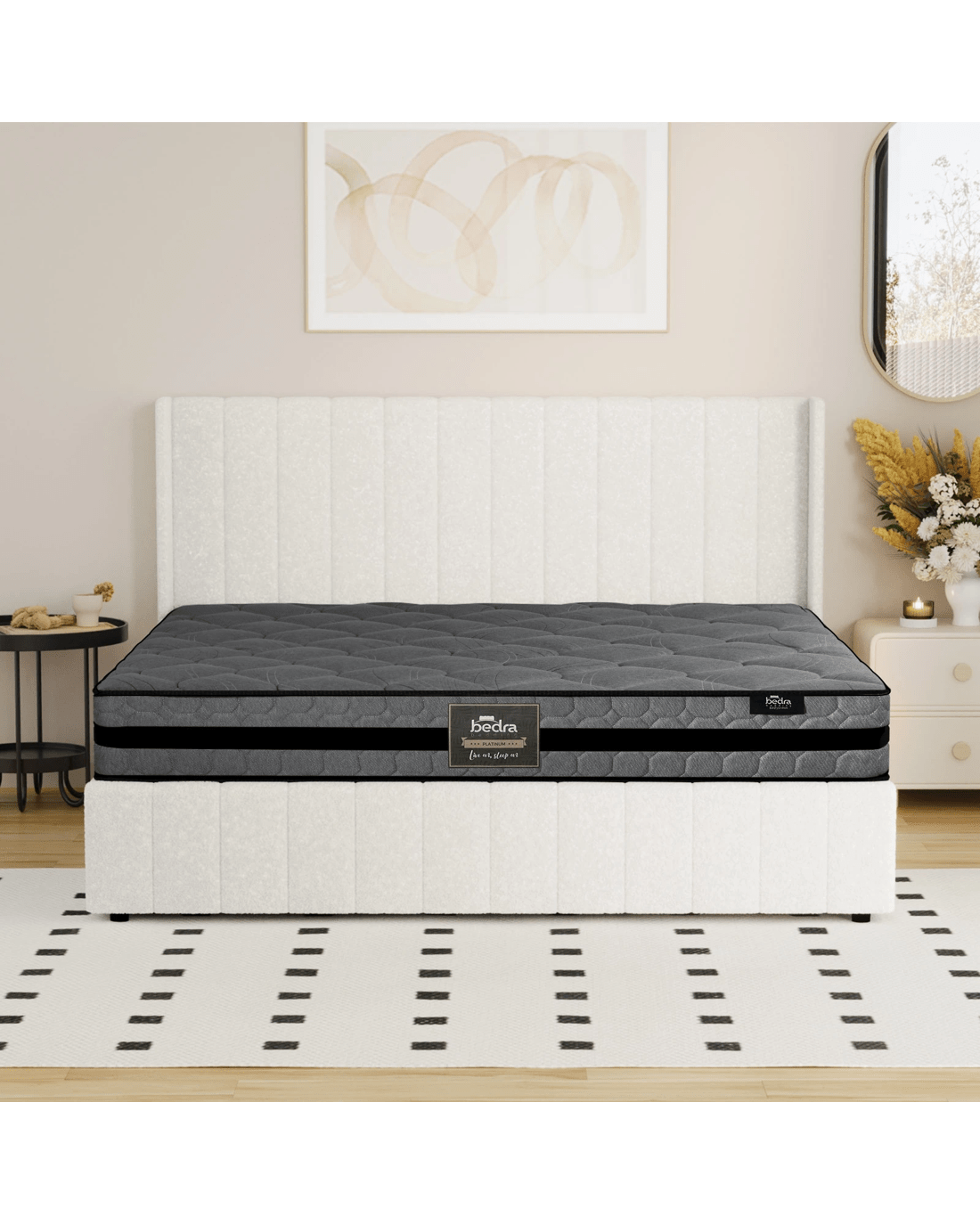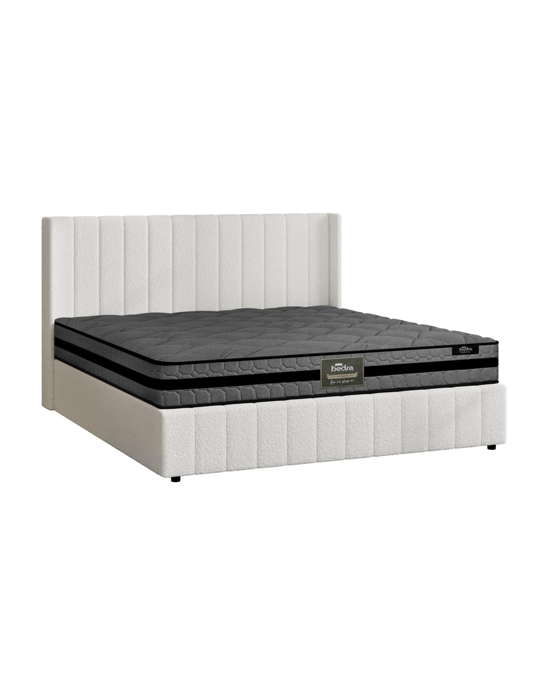 Best of all, the stylish bed frame also includes a comfortable Bedra Bedding Pocket Springs mattress to complete the set. This high-quality spring mattress features all the benefits of an independent pocket springs system that provides reinforced edging, motion isolation, anti-disturbance and full body support. Naturally, the highly breathable mattress complies with all required standards and certification and is hygienically safe from top to bottom and everything else in between.