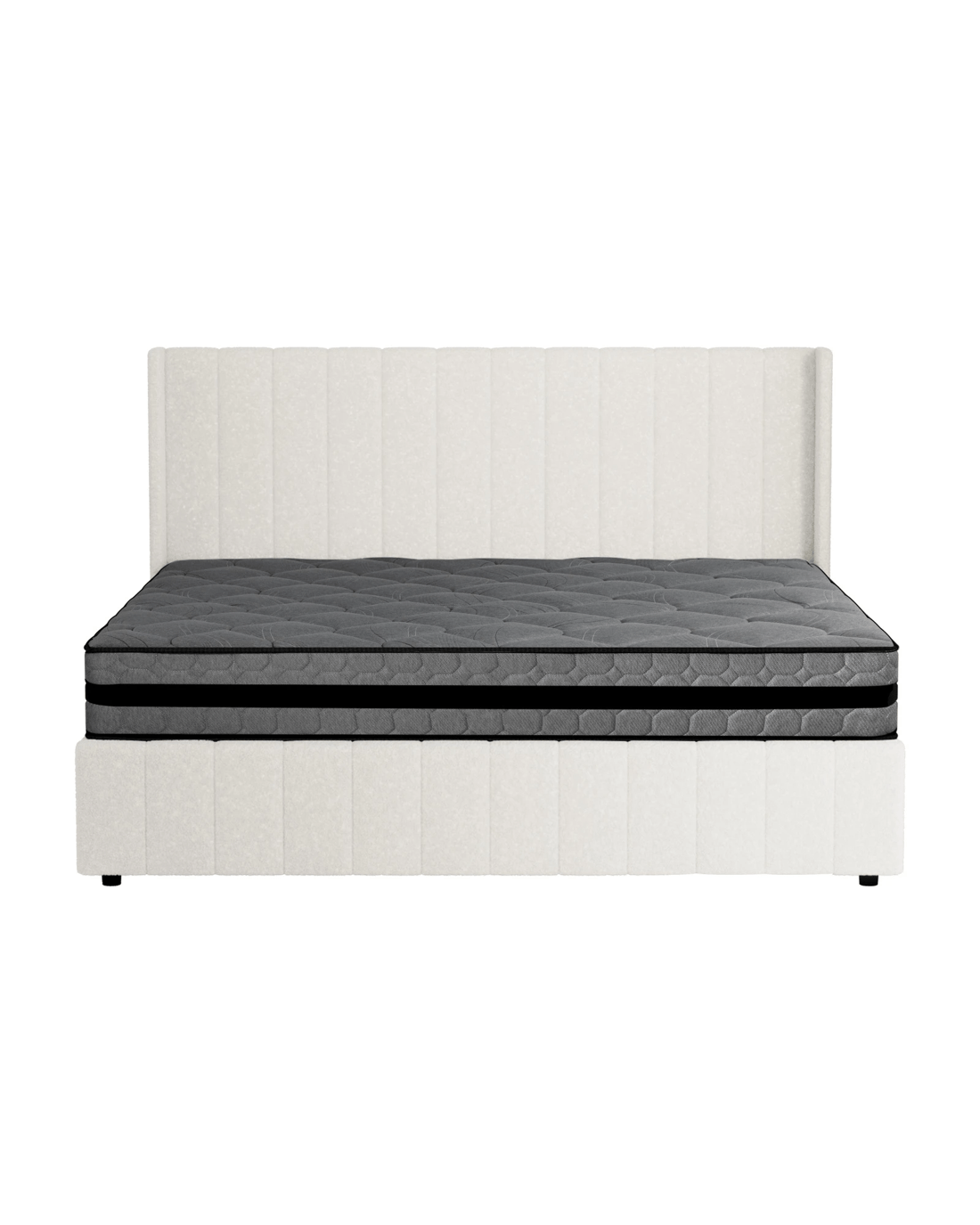 Featuring a well-padded winglet bedhead and bed end design with premium boucle fabric upholstery, the Oikiture Gas-Lift Bed Frame exudes bespoke elegance and adds a luxurious presence to any bedroom decor. Soft to the touch that lends a swank and intimate aura to accompany your calm and restful sleep.
