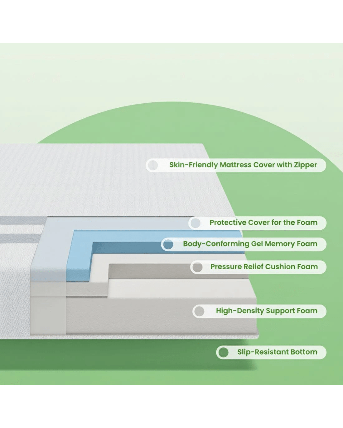 The gel-infused memory foam layer helps regulate temperature, keeping you cool throughout the night, while the high-density support foam enhances durability and airflow for a fresh, restful sleep.