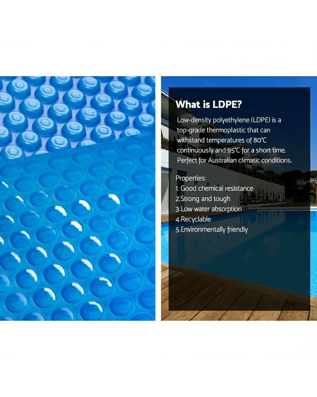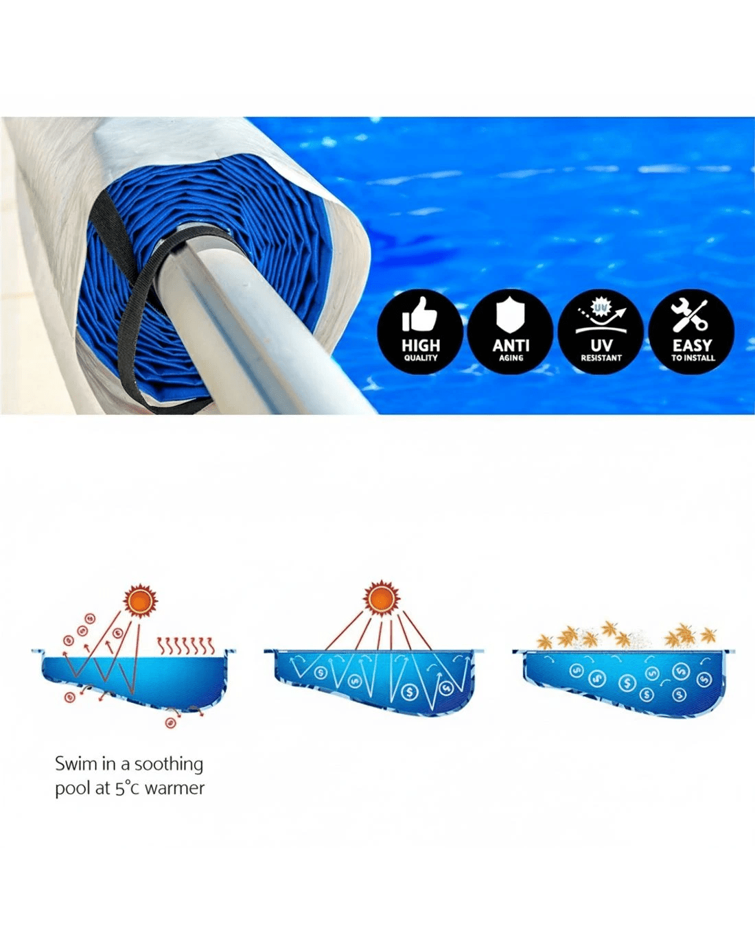 Keep your pool clean from debris and warm from the power of the sun with Aquabuddy's Aluminium Pool Roller and 11m x 4.8m Pool Cover. Made of sturdy aluminium construction with full adjustability, this pool roller is suitable for pool with a width between 2.4m-5.55m. It is equipped with premium anodized aluminium alloy stands, plastic wheels for maximum portability, and an exclusive non-slip spinning wheel design to easily roll up your pool cover and get right in the water. The solar pool cover is made from premium low-density polyethylene 500 Micron, which makes it extremely durable. Well, the design allows the sun rays to penetrate the pool, increasing the temperature and significantly reducing water evaporation. Aquabuddy helps heat the pool easier and faster, and retain more heat in the pool for a longer time. Finally, the cover keeps the pool water clean all year round, reducing the time spent maintaining the water, pumps and filters. Save money, save time, save summer! Get the best of natural resources and save money on chemicals and water; get yourself an Aquabuddy Pool Roller and 11m x 4.8m Cover set today!