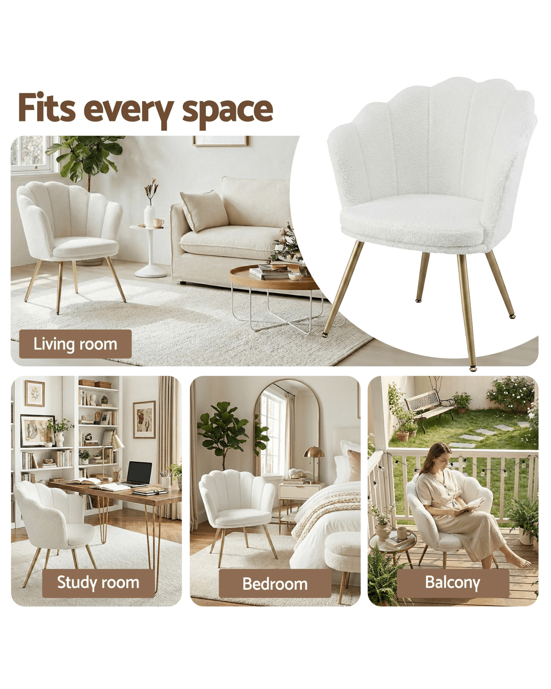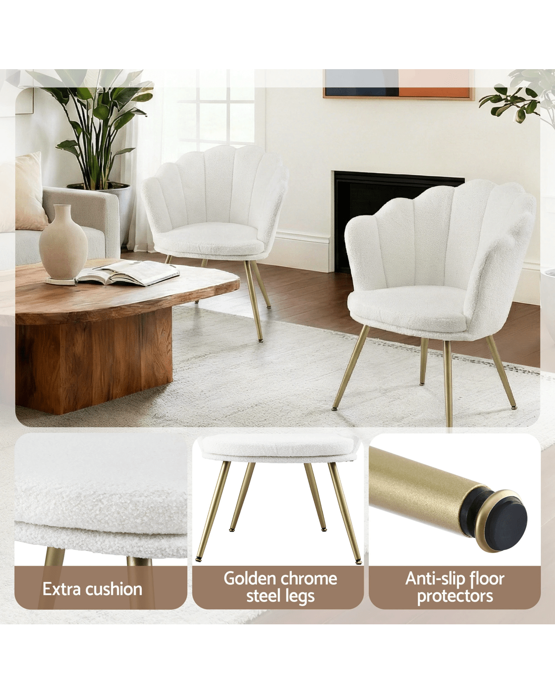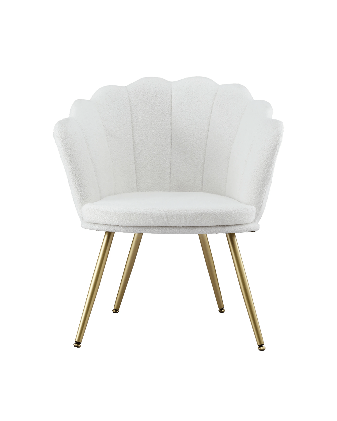 With its thick padding of high resilience foam and teddy fleece upholstery, our Artiss armchair is perfect as a reading chair or a favourite relaxation seat. The vintage-style scallop shell back wraps around and hugs your body to provide perfect support and comfort. The splayed metal legs in glamorous gold give the armchair loads of character as well as providing a very stable base. Not least, the workmanship is meticulous with the fluid corners and sturdy wooden frame. The armchair will blend well with any setting from classic to contemporary and will also soften the flow of rooms with angular furniture and accents.