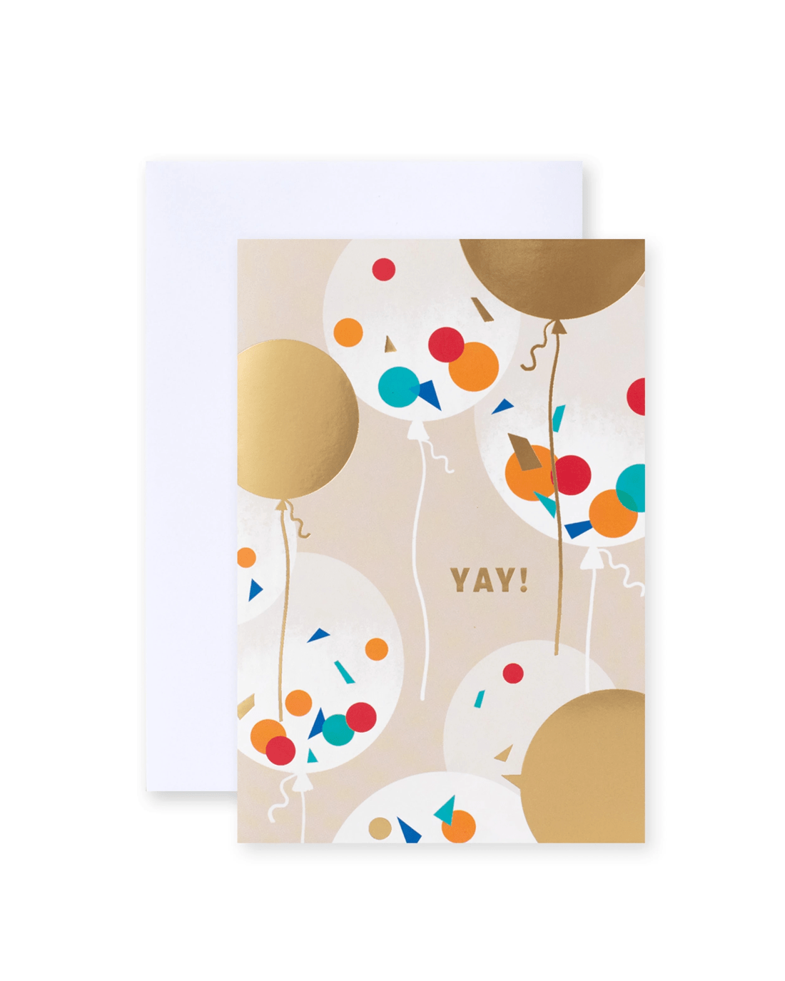 • The front of design one features an abstract balloons design, gold foil highlights, with the message 'YAY!'