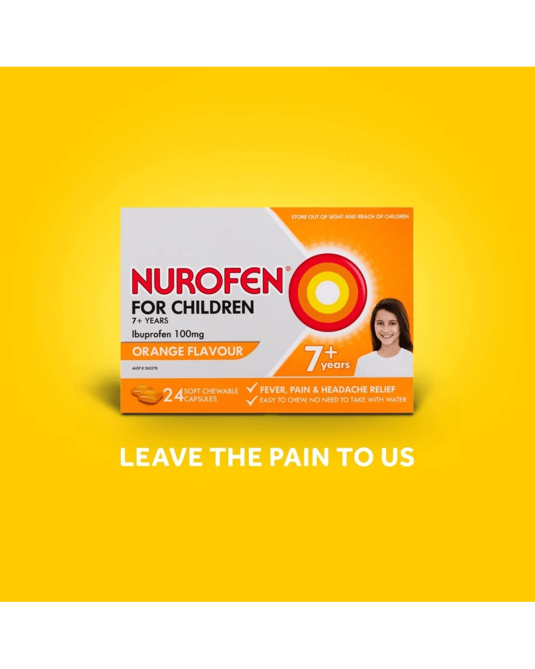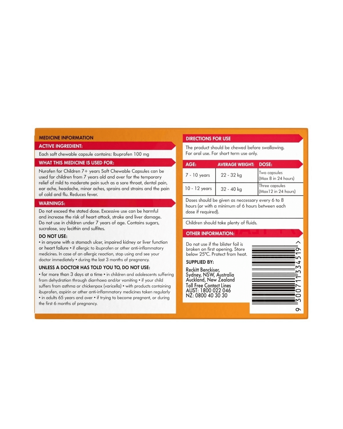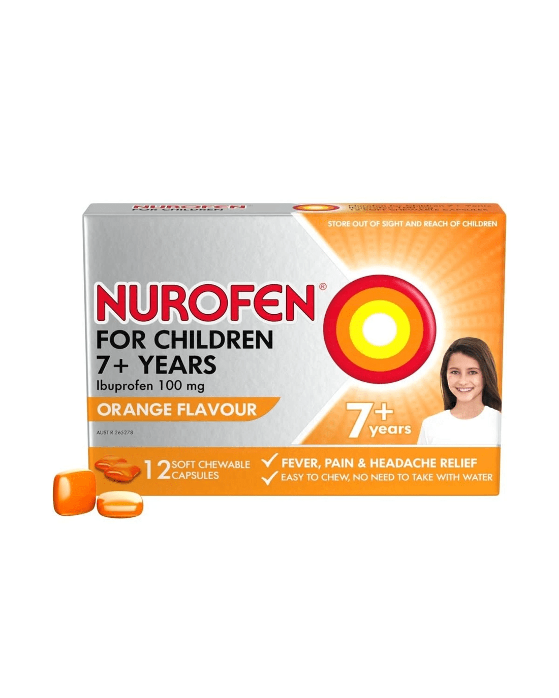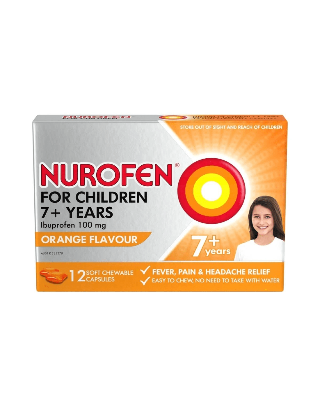 Sold by Kmart12 Pack Nurofen Ibuprofren for Children Orange Flavour 100mg Capsules