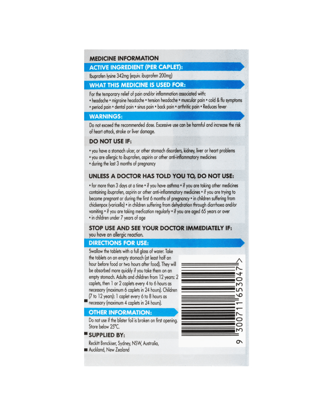 • Active ingredient per caplet: Ibuprofen lysine 342mg (equiv. ibuprofen 200mg)