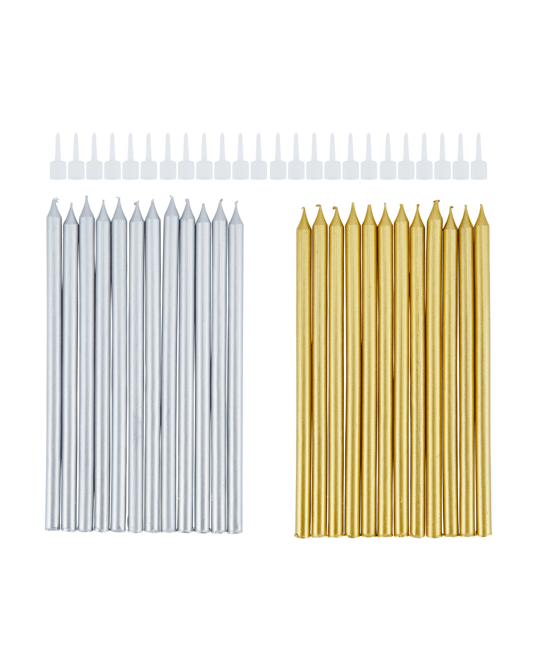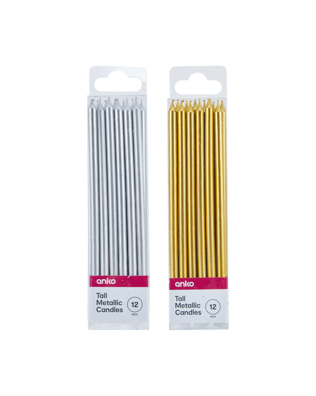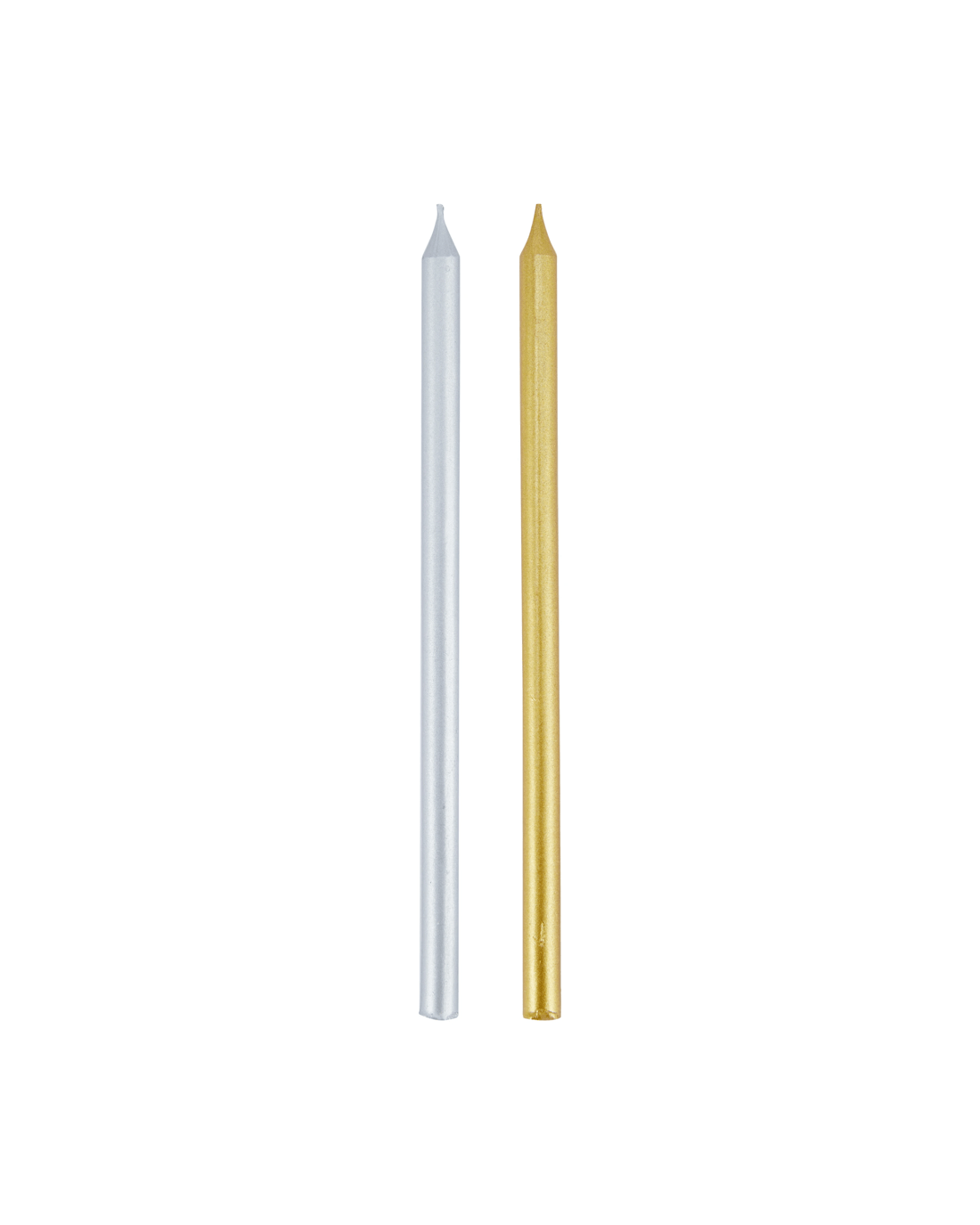 Elevate your cake game with the 12 Pack Tall Metallic Candles - sleek, stylish and shimmering. Perfect for milestone moments, they add a touch of glamour to any celebration.