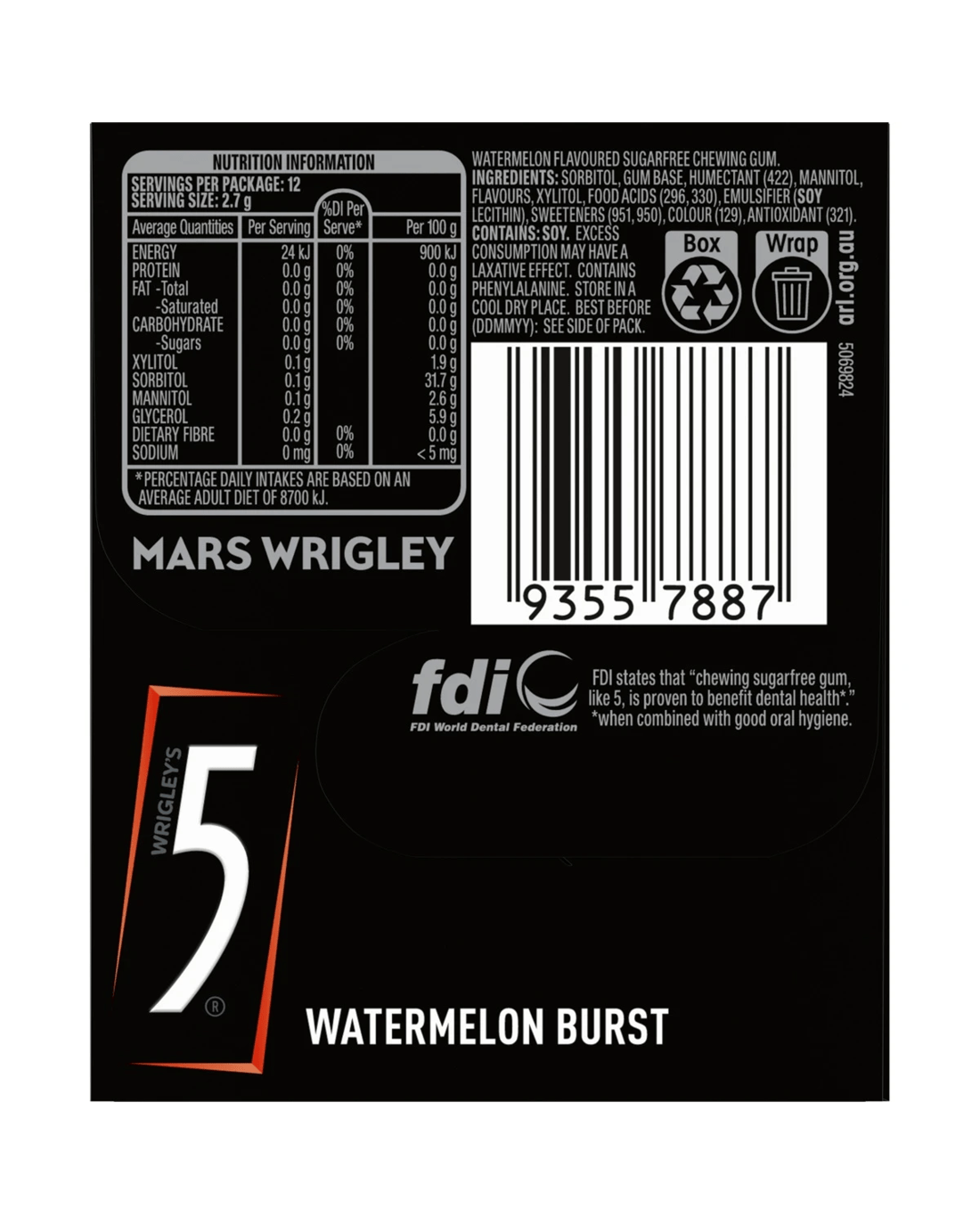 Sold by Kmart12 Piece Wrigley's 5 Gum Watermelon Burst Sugar Free Chewing Gum 32g