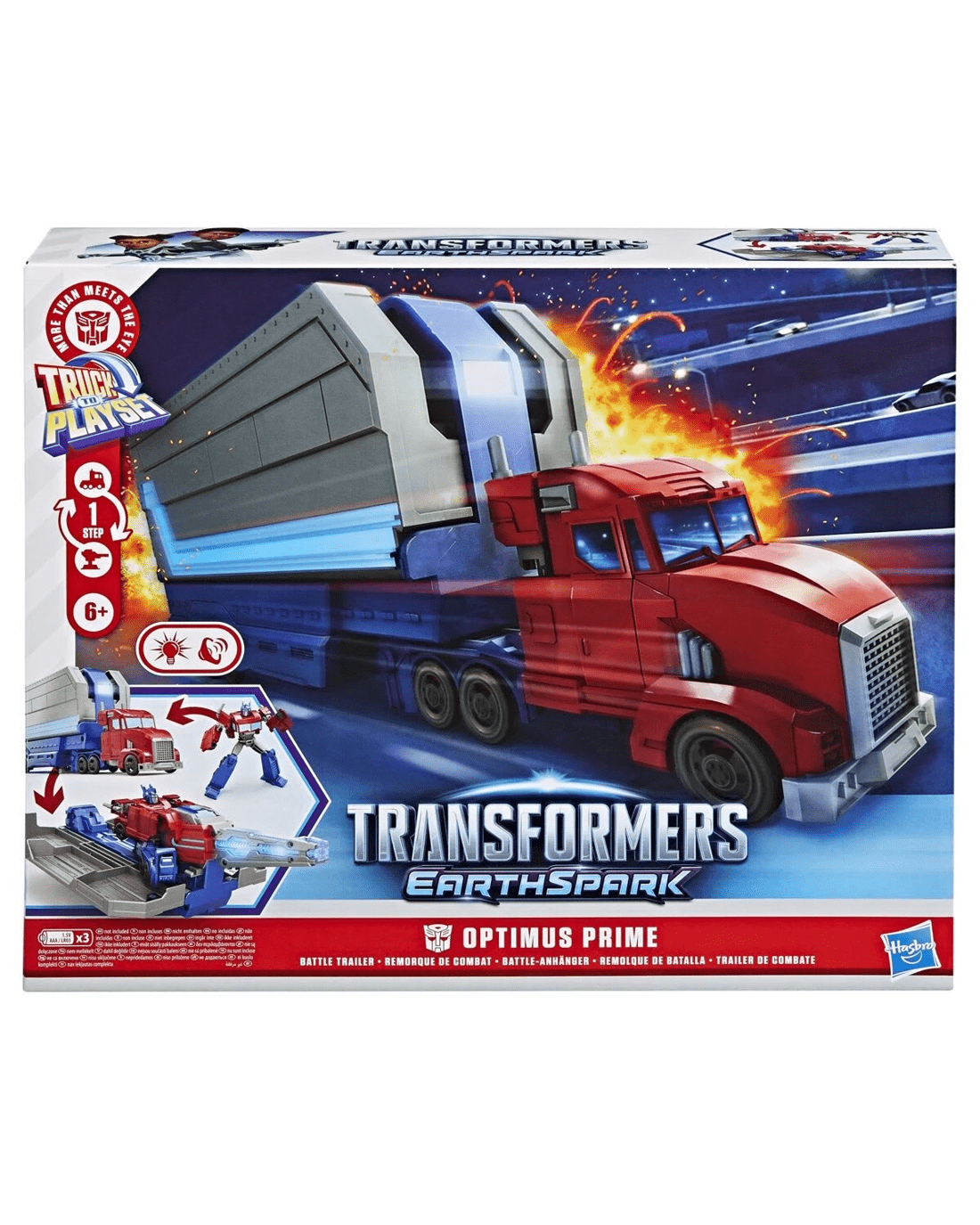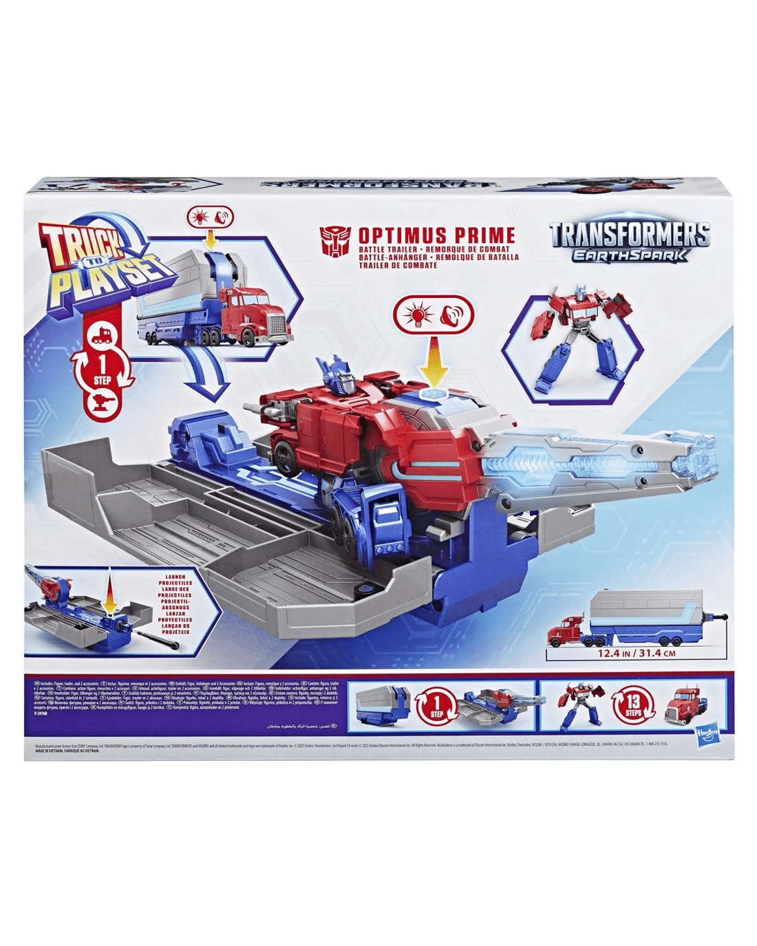 Get ready to roll into battle with the Transformers Optimus Prime Battle Trailer playset! There are so many ways to play with this awesome Transformers toy. Put the 13cm Optimus Prime figure into toy truck mode, then attach the playset in trailer mode and roll out! Then, convert the Optimus Prime action figure into robot mode and flip the blaster on the playset to see it open up into a battle station. The figure can sit in the battle station and man the light-up blaster or the projectile launcher. Kids can load a projectile into the launcher and launch it with the press of a button! With lights and unique sounds in each mode, kids can feel like part of the exciting action of the Transformers: EarthSpark show. Electronic toys like the Optimus Prime Battle Trailer make great gifts for boys and girls 6 and up who love Transformers figures and toy cars.