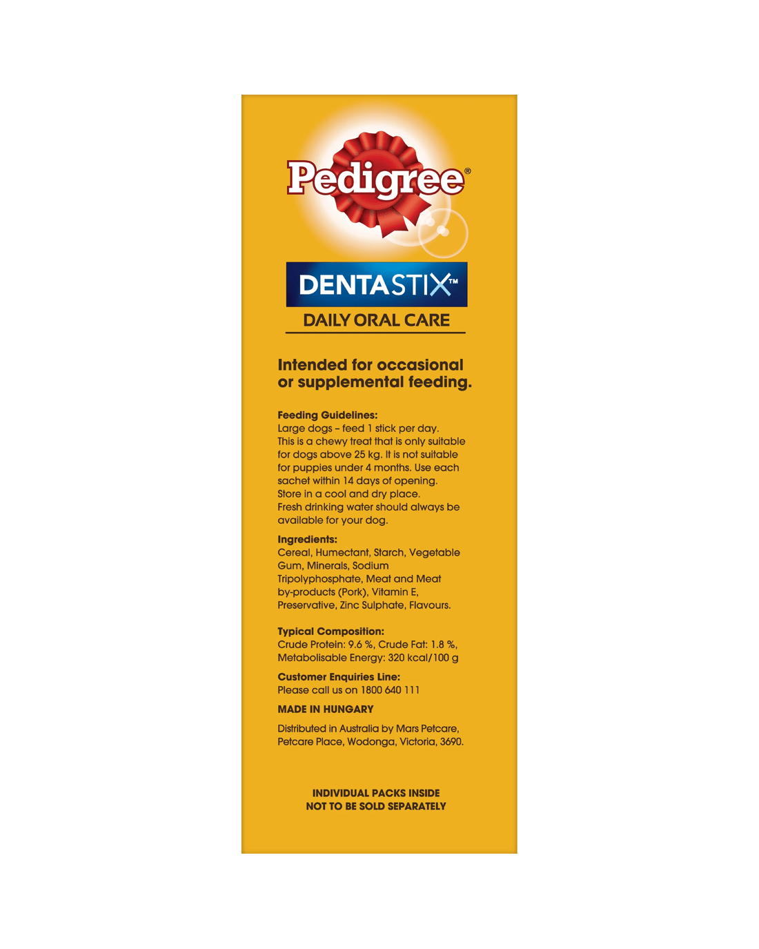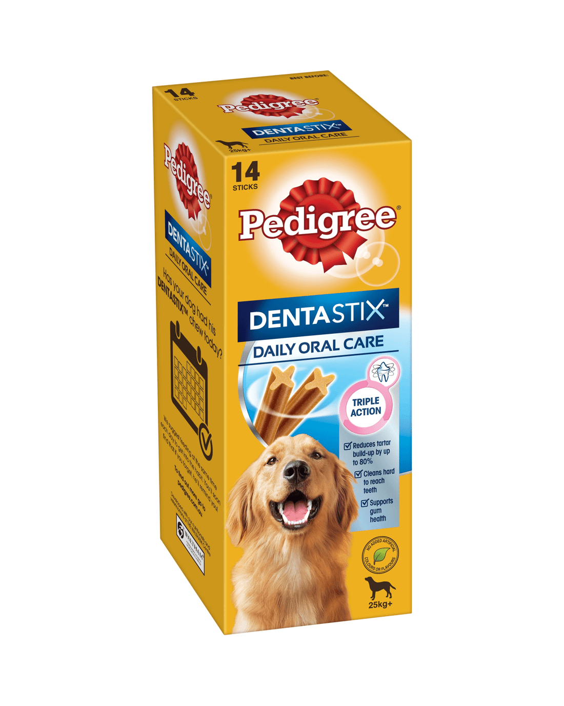 Pedigree Dentastix Daily Oral Care chews have a unique X shape, special texture and two active ingredients that, when fed daily, are scientifically proven to help reduce the build-up of tartar by up to 80%, clean hard to reach teeth and support gum health. Given four out of five dogs over the age of three have gum disease, caused by the build-up of plaque and tartar, you can help keep your dog's teeth and gums healthy and strong with a delicious and effective Pedigree Dentastix Daily Oral Care chew every day. Pedigree Dentastix Daily Oral Care chews contain two active ingredients that bond with the calcium in saliva and slow down the build-up of tartar.