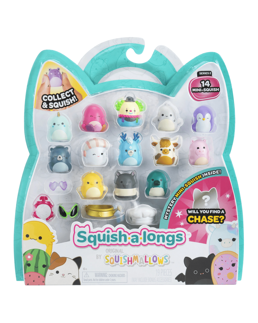 Get ready for a new level of squishy fun with Squish-a-longs, the latest addition to the Squishmallows family! An adorable and portable collectible, Squish-a-longs Mini-Squish, made of squeezable plastic, is perfect with its 1-inch size! With this 14 Pack (including one blind) the fun is endless! Will you be able to find the special Chase figure?