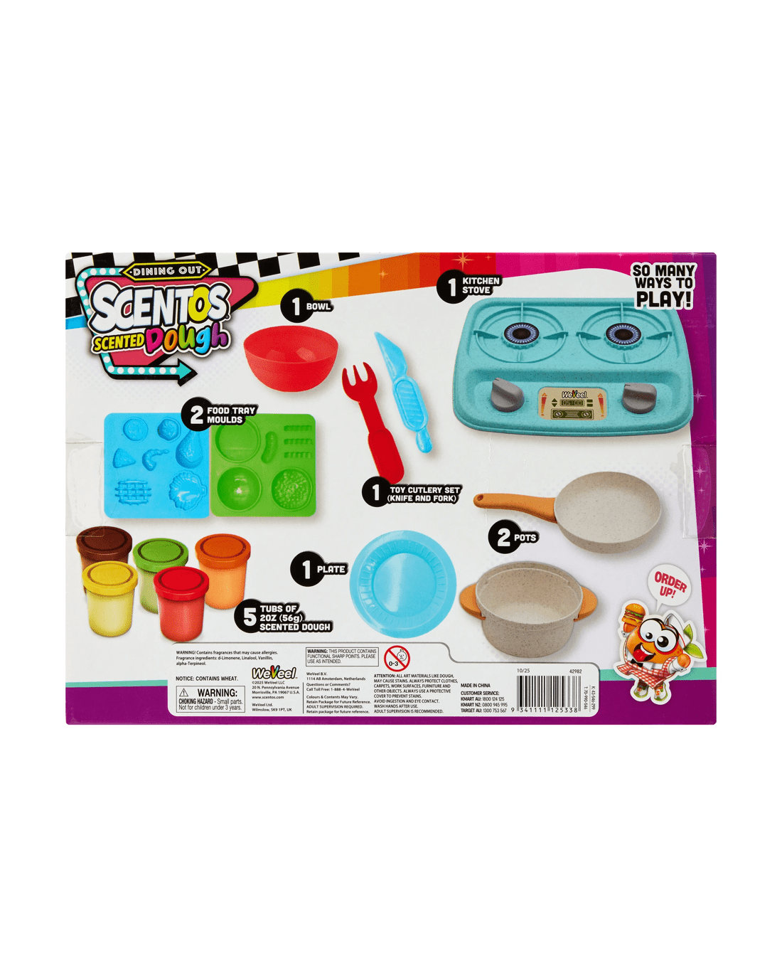 • Includes 1 x kitchen stove, 2 x pots, 1 x plate, 1 x bowl, 1 x toy cutlery set (knife and fork), 2 x food tray moulds and 5 x dough tubs