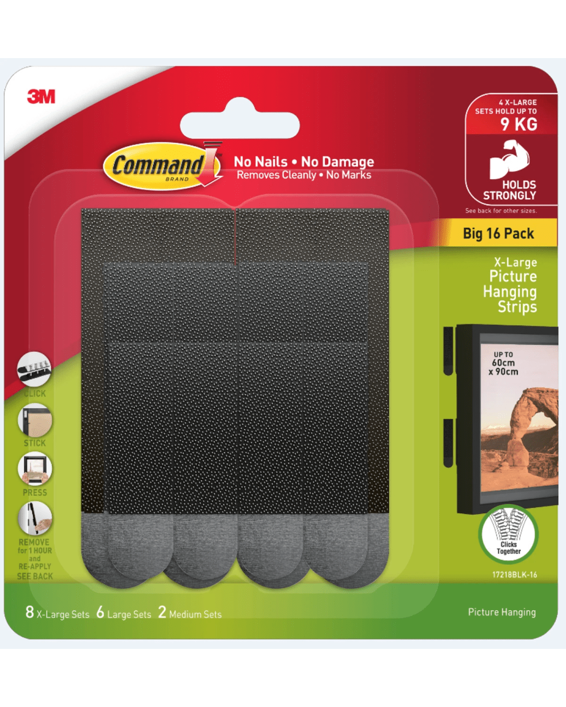 Whatever your style, Command Picture Hanging Strips make it easy to transform your space and make it your own. Forget about nails, screws and tacks, Command Picture Hanging Strips are fast and easy to hang - no more holes to worry about! Strips snap and lock together, providing a secure stronghold. Using the revolutionary Command Adhesive, they hold strongly on a variety of surfaces, including painted walls, wood, tile and more. Yet, removes cleanly - no holes, marks, sticky residue or stains.