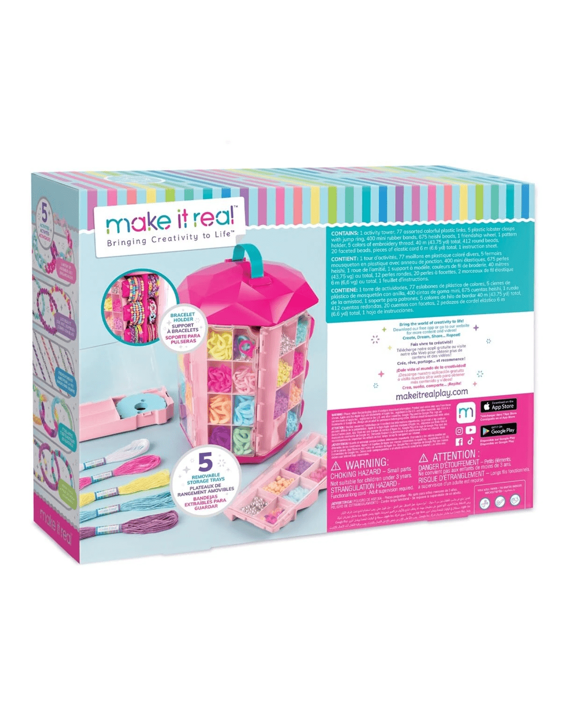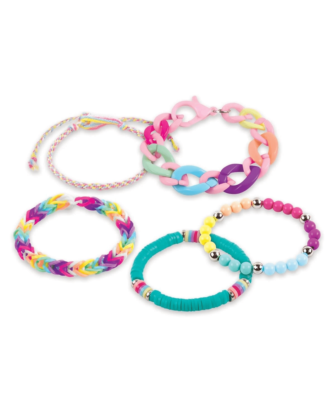 - Includes 1 x activity tower, 77 x assorted colourful plastic links, 5 x plastic lobster clasps with jump ring, 400 x mini rubber bands, 675 x Heishi beads, 1 x friendship wheel, 1 x pattern holder, 5 x colours of embroidery thread, 412 x round beads, 20 x faceted beads, 2 x pieces of elastic cord and 1 x instruction sheet