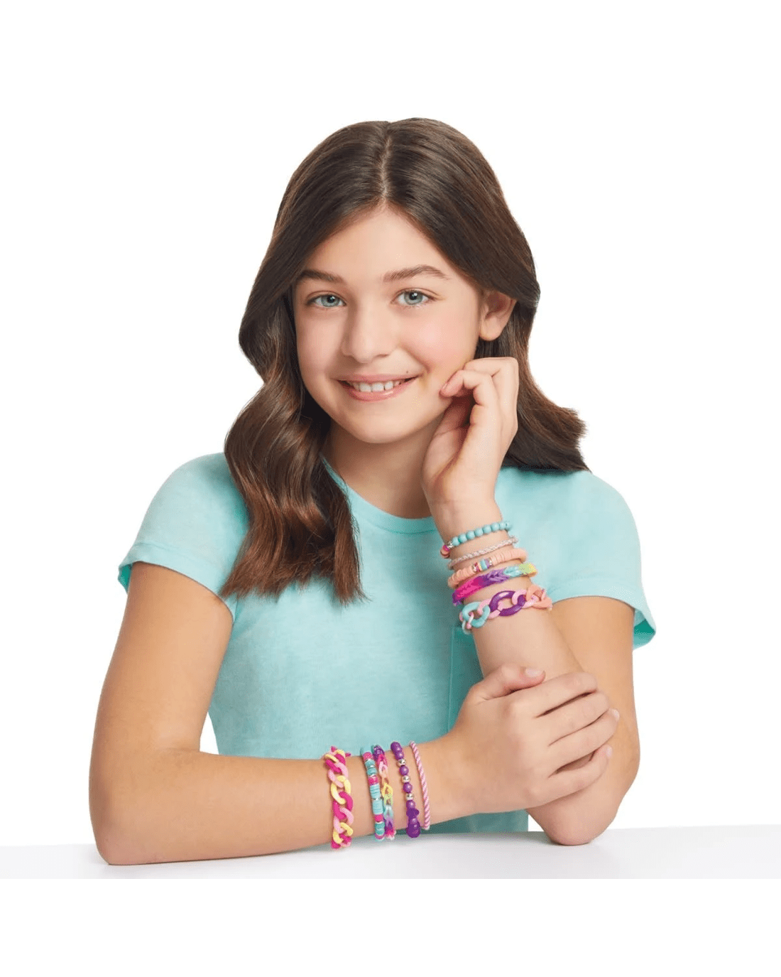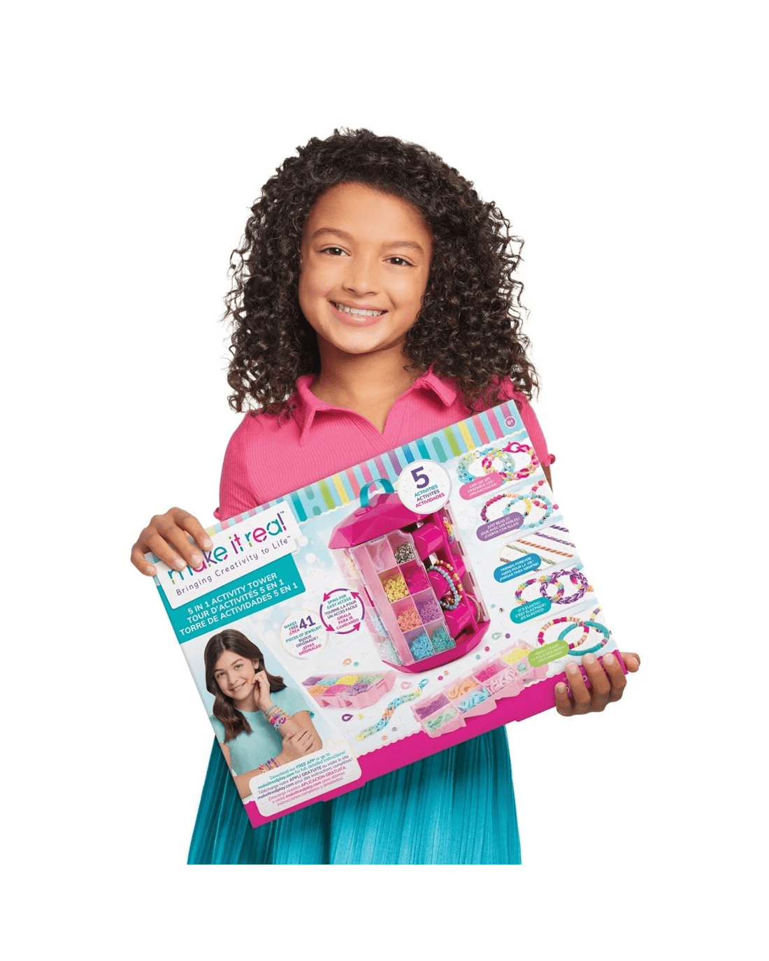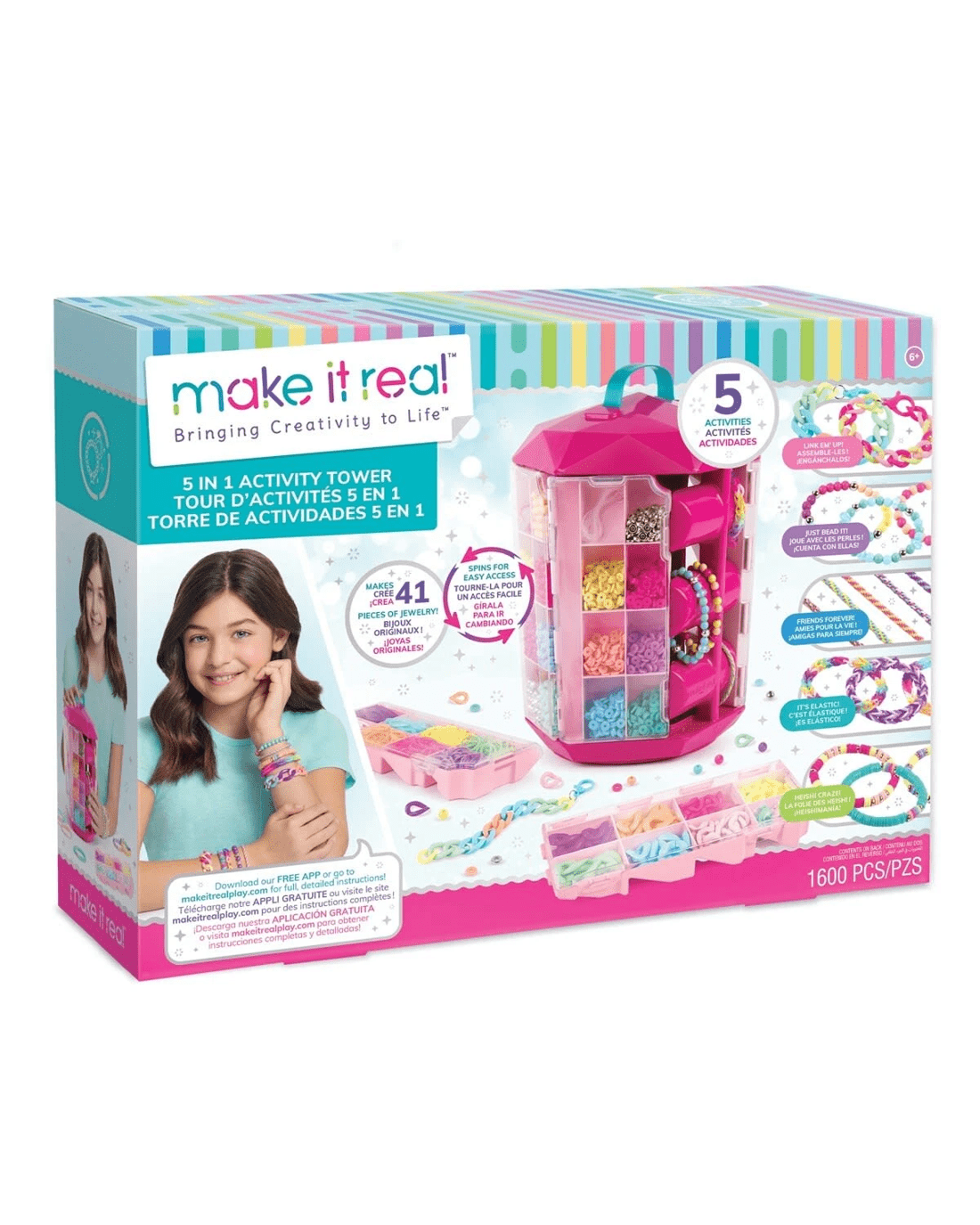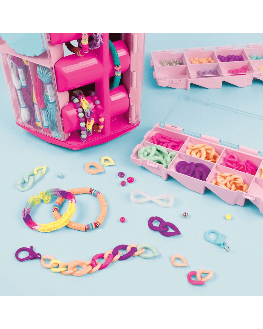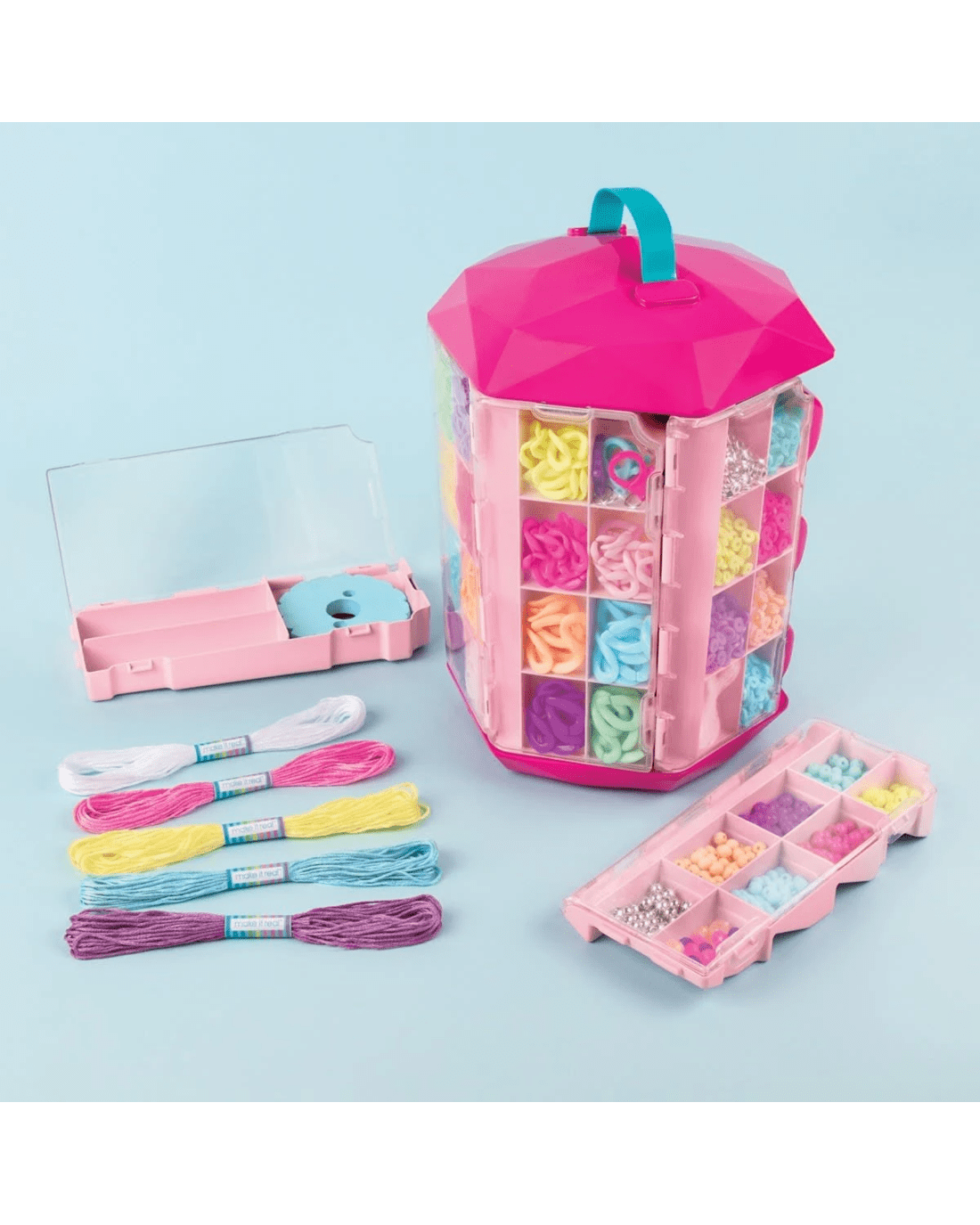 Five great jewellery activities in one full storage solution! The 5-in-1 Activity Tower rotates for easy access and has five removable storage trays and a bracelet holder to display creations. Each storage tray houses a unique activity; Heishi Craze, Just Bead It, It’s Elastic!, Friends Forever and Link Em’ Up! The trays can be removed to take on the go or used beside the tower for easy access. Take one or all five activities with you! Make over 40 pieces of jewellery with the included 1600 components.