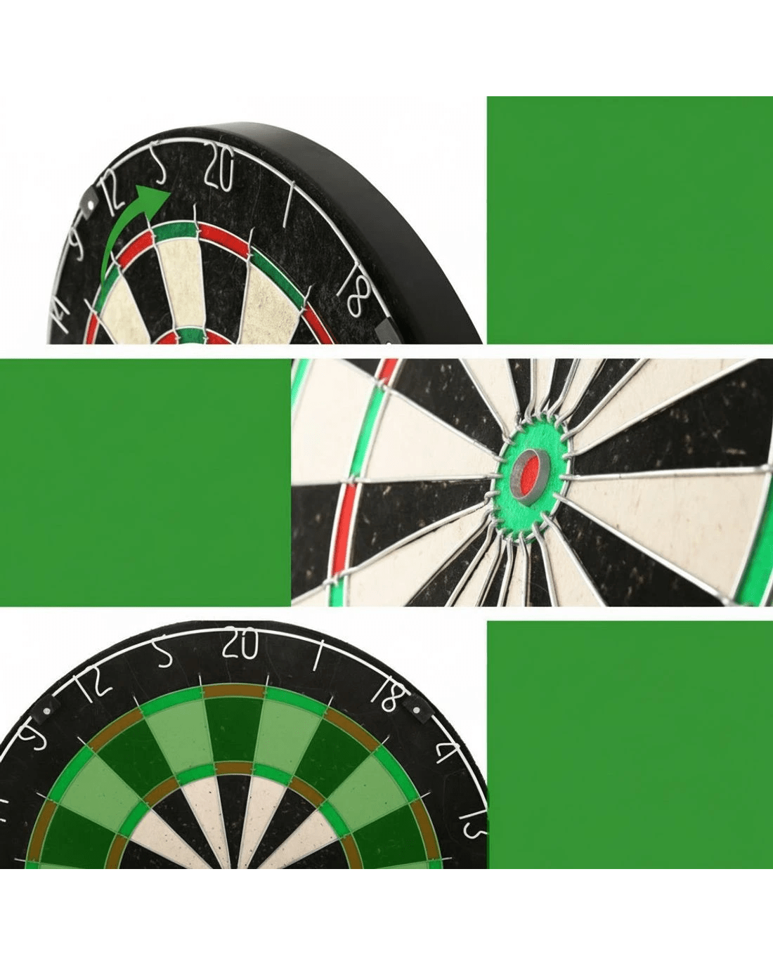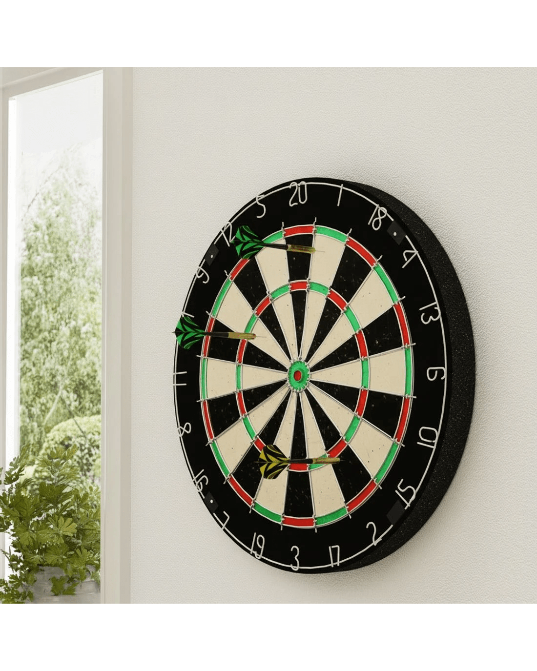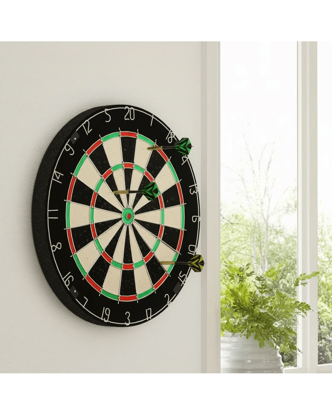 Get competitive at your next party or function with a classic Dartboard. The dartboard is made from premium quality sisal fiber panels with a sturdy rotating score ring and features six heavy-duty darts for classic play. The board has unique features such as a staple-free divider to prevent bounce-out, an extended dart catchment area and protective rubber feet. The sisal fiber panels are self-healing and the scoring ring rotates to extend the life of your dartboard. The darts are made from stainless steel and feature a skid-resistant grain and flexible top, giving you more control over the flight path. The board is not only a fun game but its upgraded design is stylish and modern and will suit any home or business. Easy to assemble with the included wall mount bracket and fixings, you'll have plenty of fun with our sporty premium Dartboard.