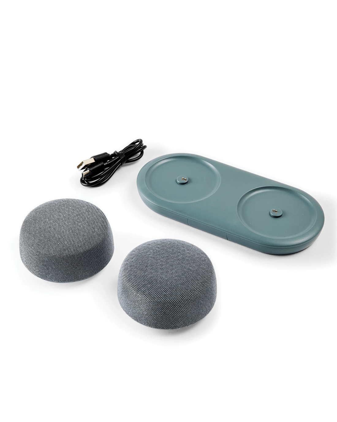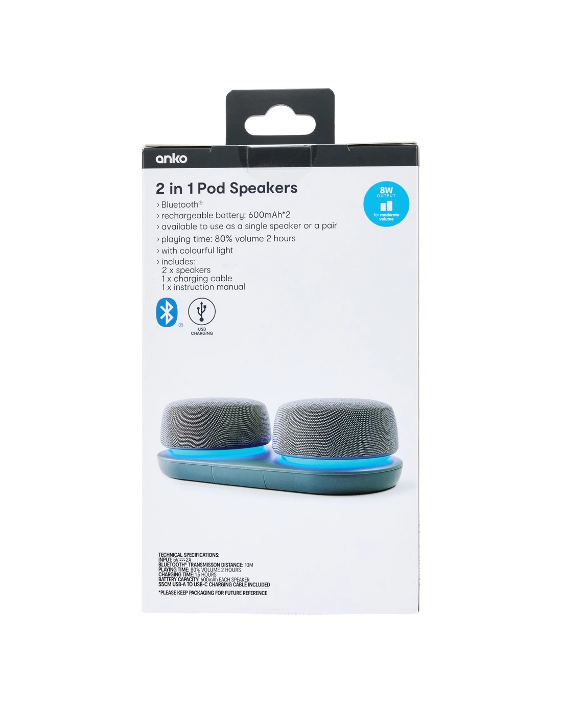 - Includes 2 x speakers, 1 x charging cable, 1 x instruction manual