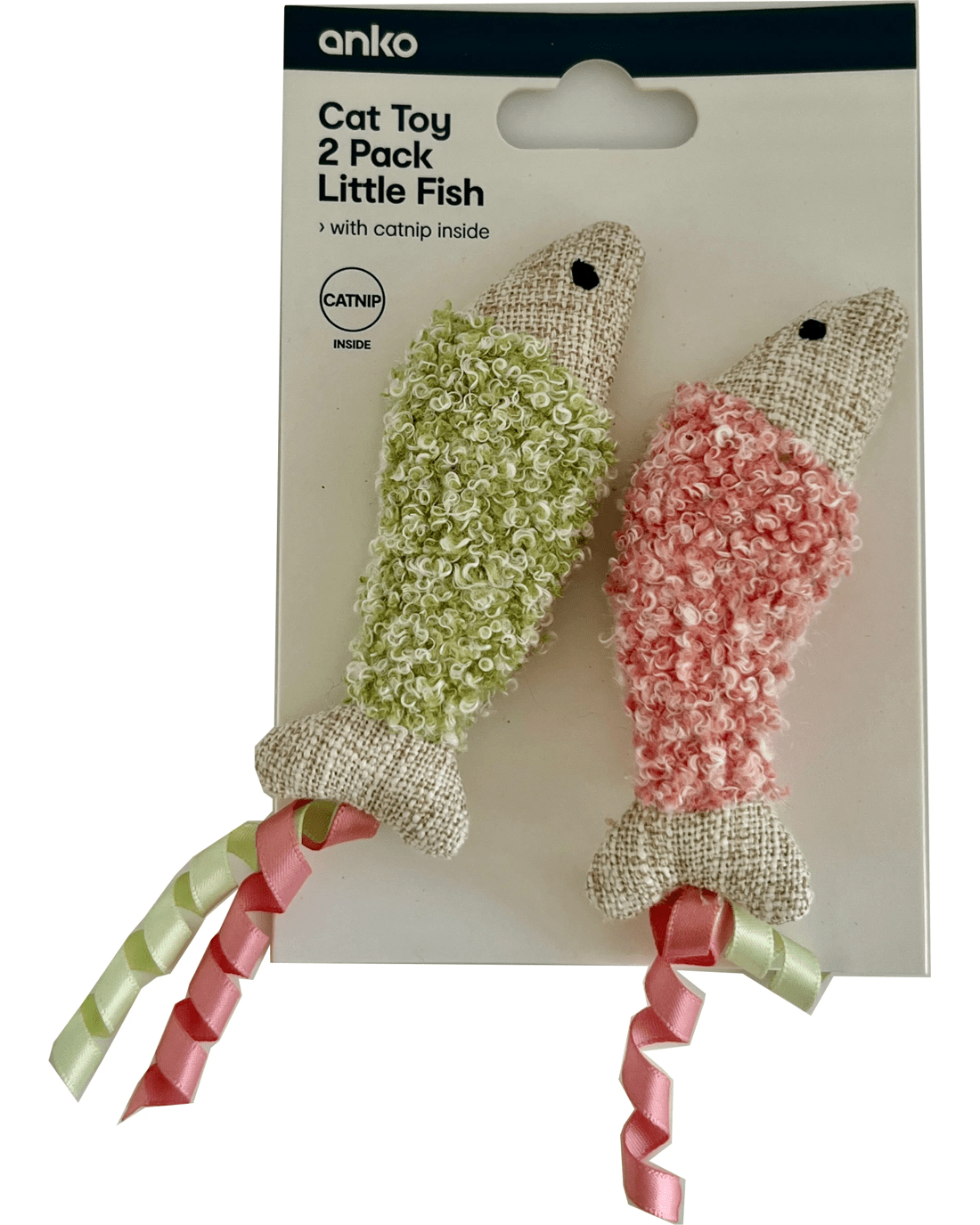 Keep your feline friend happily engaged with this soft fabric fish duo in playful red and green. Each fish contains irresistible catnip and features a ribbon tail for extra excitement.