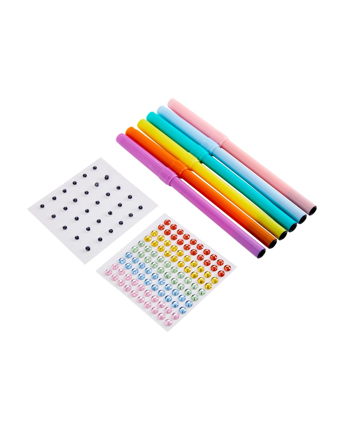 - Includes 8 x colouring sheets, 2 x velvet art sheets, 1 x sticker sheet, 1 x stencil sheet, 6 x colour markers, 1 x adhesive googly eyes sheet and 1 x adhesive gems sheet