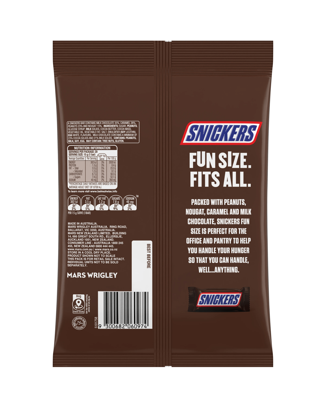 Packed with peanuts, nougat, caramel and milk chocolate, the Snickers Fun Size chocolate bag is perfect for the office and pantry to help you handle your hunger so that you can handle, well...anything. The perfect satisfying treat for those hungry moments on the go or when you need a chocolate bag snack to keep you going until dinner. Packed with nuts, it's satisfaction in every bite of this delicious Snickers chocolate bag. With 20 individually wrapped fun-size Snickers bars, this share pack is perfect for sharing with friends, filling Halloween trick-or-treat bowls and party bags.