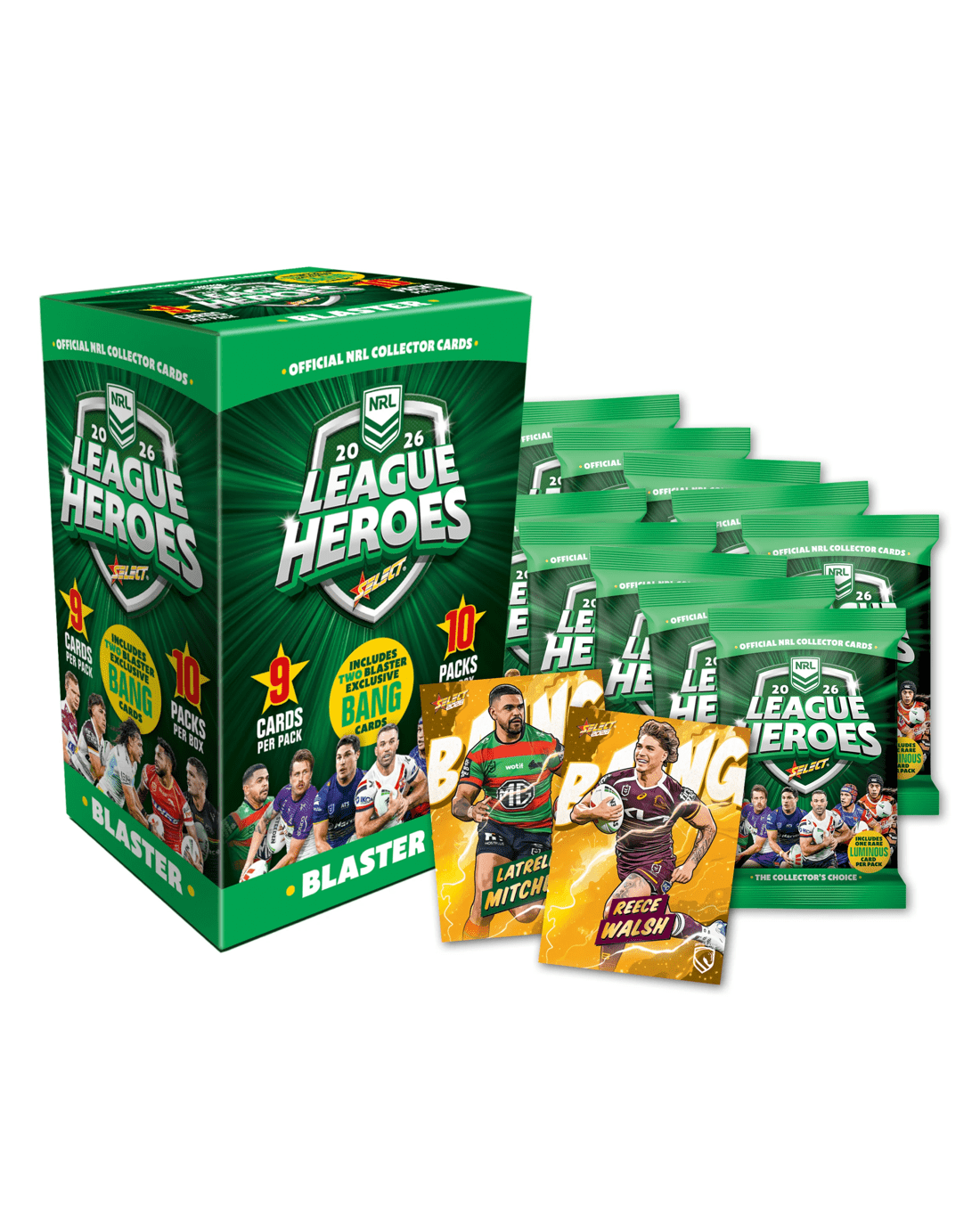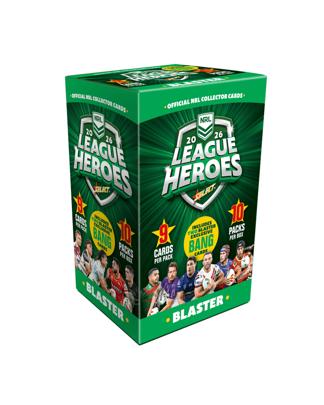 The limited Blaster Box contains 10 packs of 2026 NRL League Heroes collector cards and a Blaster/Locker EXCLUSIVE bonus pack of two gold bang cards. This bonus pack is only in the 2026 NRL League Heroes Blaster Box and Card Storage Locker. There are 85 cards in the gold bang set.