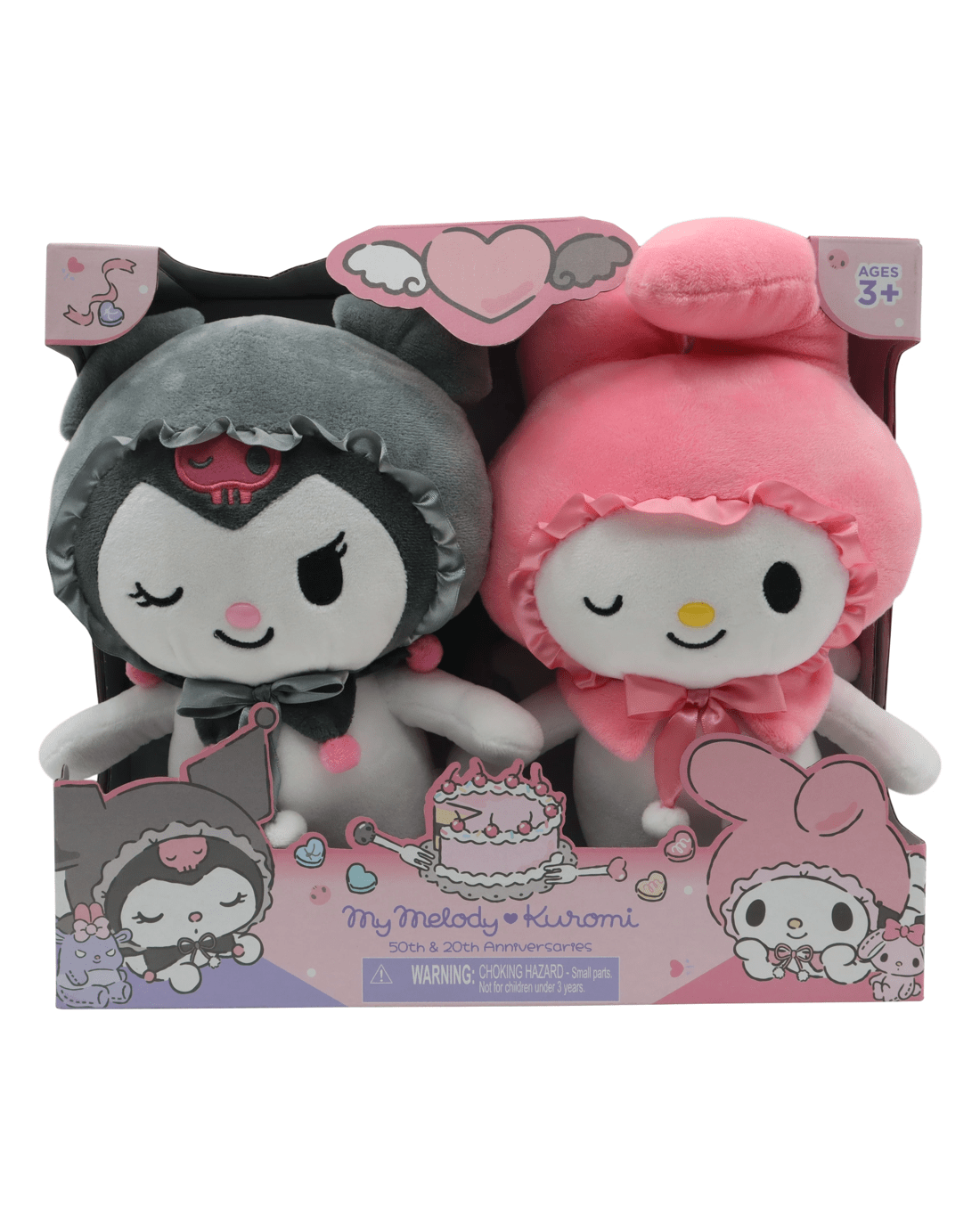The My Melody Kuromi 50th & 20th Anniversary Plush Twin Pack brings two Sanrio favourites together in one dreamy collection. Both plushies are extra soft, detailed with their signature hoods, sweet bows and the cutest little wings - ready to flutter straight into your heart.