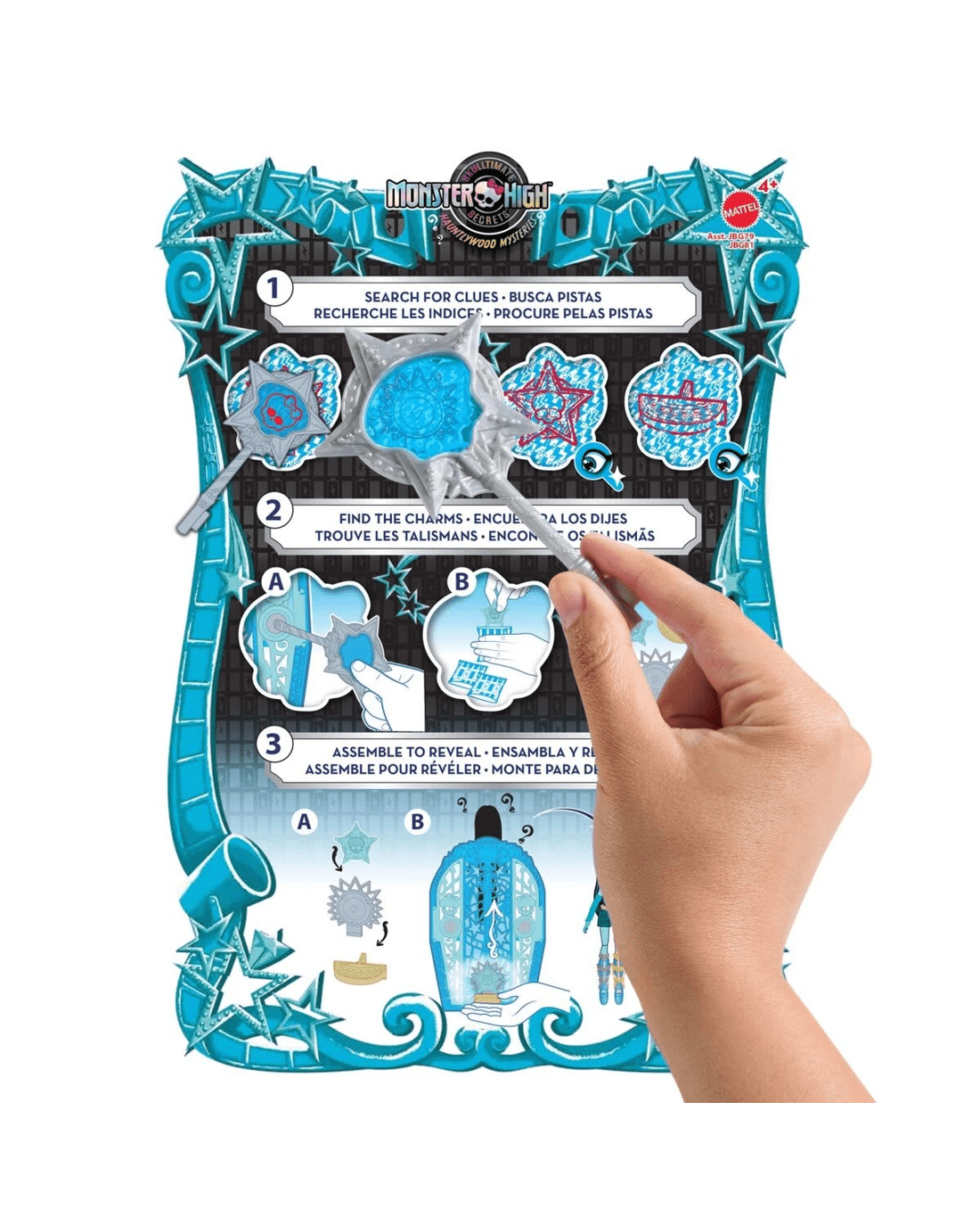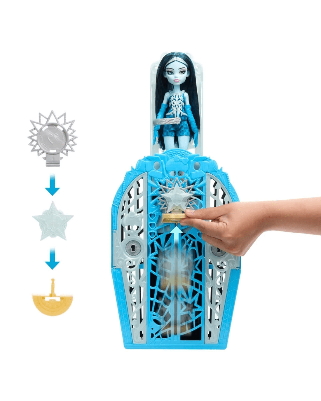 - Insert the talisman at the base of the closet, then glide it up like a zipper to unveil Frankie Stein doll in all their voltageous glory! Repeat the reveal again and again for nonstop fun