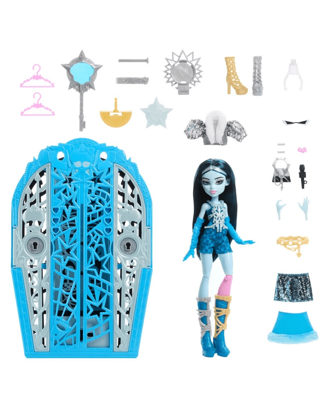- Includes 1 x Frankie Stein doll, 1 x closet with two doors, 1 x key, 2 x maps, 3 x charms, 2 x hangers and assorted clothing and accessories