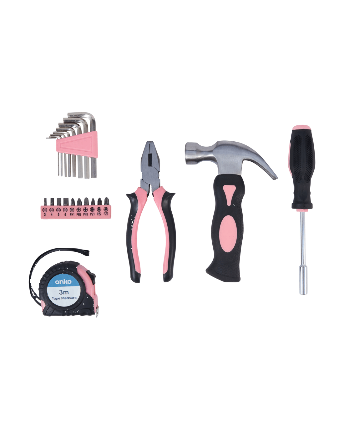 - Includes combination pliers, 8 x piece hex keys, 10 x piece 25mm screwdriver bits, measuring tape and stubby hammer