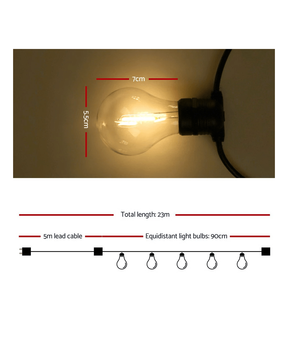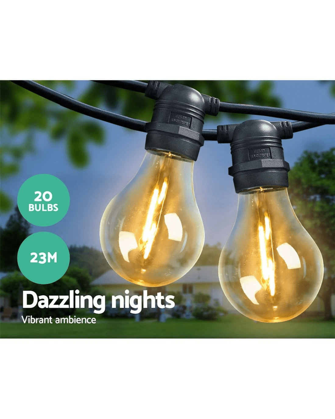 Our Festoon String Lights are great not only for wedding and birthday parties or special events, but also for creating a warm, inviting ambience with its bright and mellow glow. Suitable for both indoor and outdoor use, its IP44 rating means that it can be used in the rain and all weather conditions. Each bulb draws a very low voltage and is placed 90cm equally apart from each other throughout its 23m length for an even distribution of illumination and brightness. Not least, the each bulb has a 20,000 hours lifespan so that you can get to use the string lights for quite a while.